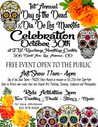 1st Annual Day of the Dead and Dia De Los Muertos Celebration at J.W. Rawlings Heritage Center Art Show 11am - 4pm Day of the Dead Theme PRIZES! Enter Artwork at museum on Oct 27th from 12pm-4pm Open to Artists who create their own Original Art; P...