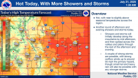 This Afternoon A 30 percent chance of showers and thunderstorms, mainly after 5pm. Mostly sunny, with a high near 98. Northeast wind around 15 mph. New rainfall amounts of less than a tenth of an inch, except higher amounts possible in thunderstor...