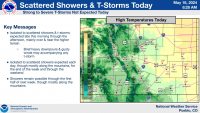 Today A 20 percent chance of showers and thunderstorms after 4pm. Mostly sunny, with a high near 87. Southeast wind 10 to 15 mph. New rainfall amounts between a tenth and quarter of an inch, except higher amounts possible in thunderstorms. Tonight...