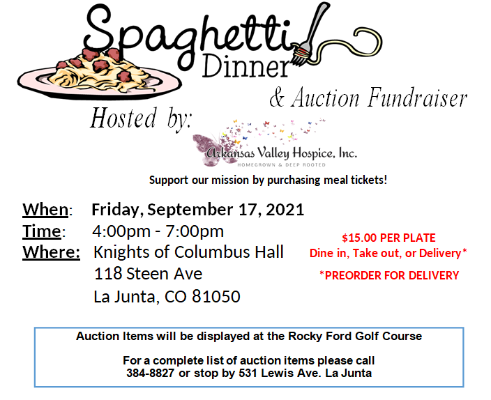 Arkansas Valley Hospice Spaghetti Dinner & Auction Fundraiser Hosted by: Arkansas Valley Hospice Support our mission by purchasing meal tickets! When: Friday, September 17, 2021 Time: 4:00pm - 7:00pm Where: Knights of Columbus Hall 118 Steen A...