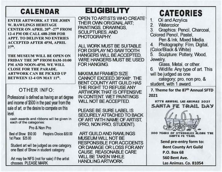 Bent County Art Guild: 15th Annual Santa Fe Trail Day Art Show - NOT CANCELLED!!! The Bent County Art Guild is still going to have the Art Show. It will be a little different but it is going to happen. The schools are bringing their students artwo...
