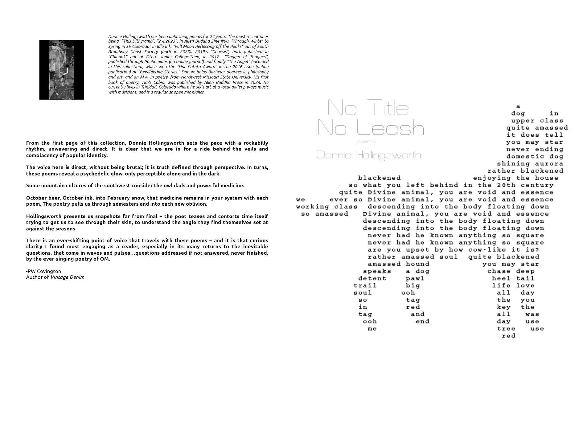No Title No Leash , the new hybrid chapbook Donnie Hollingsworth, featuring poetry and art is now available. Check out the link below where you can read three poems and an art selection. Below that is a link to the paperback. https://alienbuddhapr...