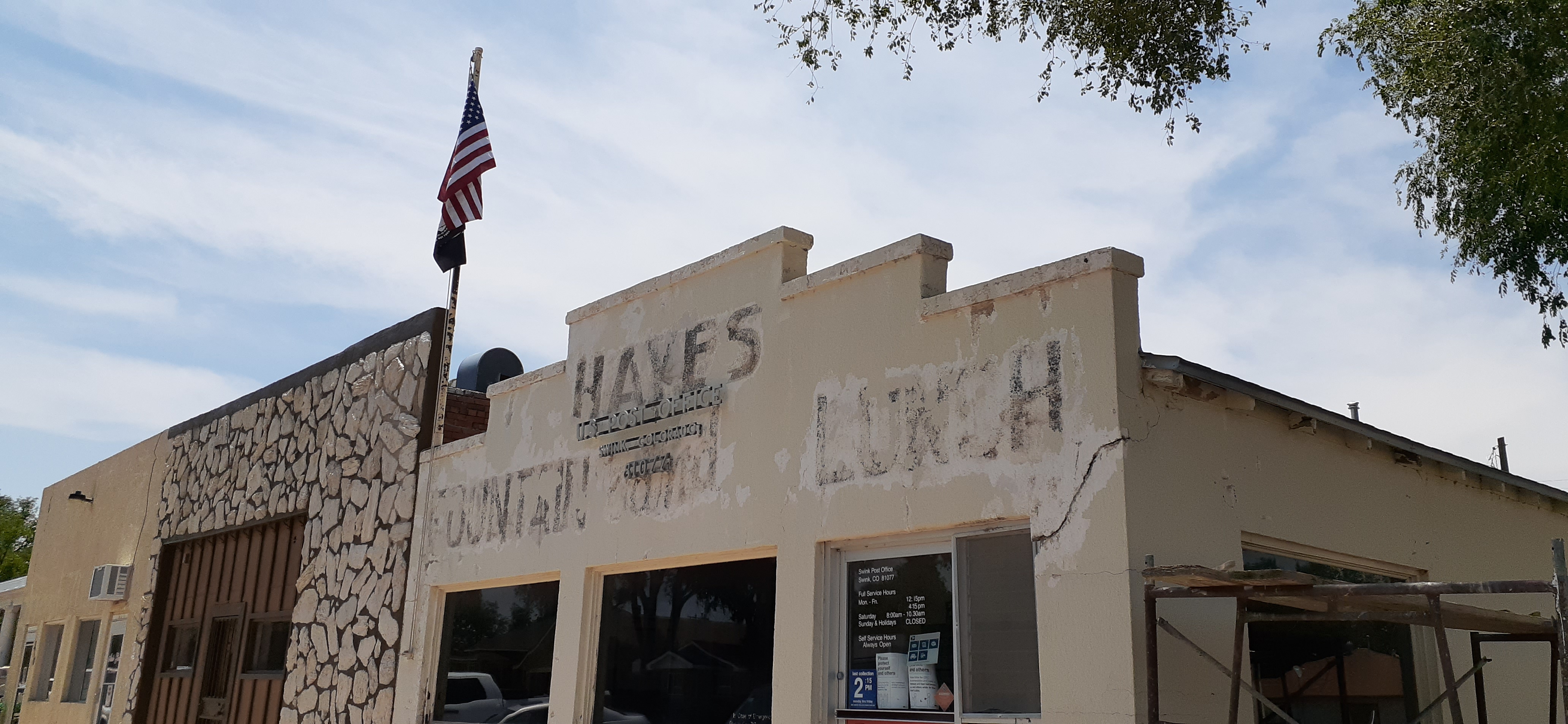 Description: Just for one day, Hayes Fountain and Lunch lettering was visible in downtown Swink Colorado. Once a cafe the Swink Post Office building has had a layer of paint over the old storefront lettering.