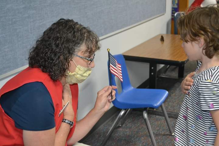 Each child met individually with a volunteer and recited the pledge, then were presented with a flag, a pencil that has the Pledge of Allegiance on it, a flag coloring book, and a flag brochure.