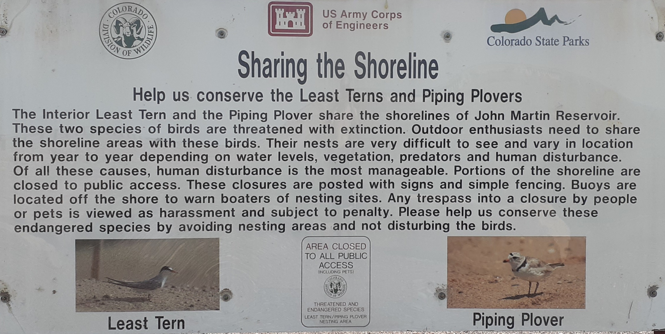 Visitors to the reservoir should be responsible and considerate of the local endangered wildlife such as the Least Tern and Piping Plover and avoid their marked nesting areas.