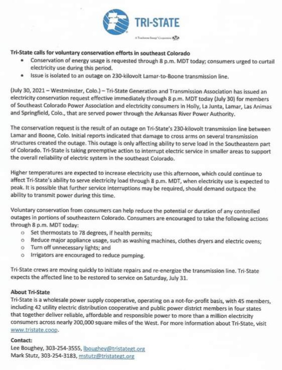 Power Outages Across Southeast Colorado - Reduced Usage Encouraged