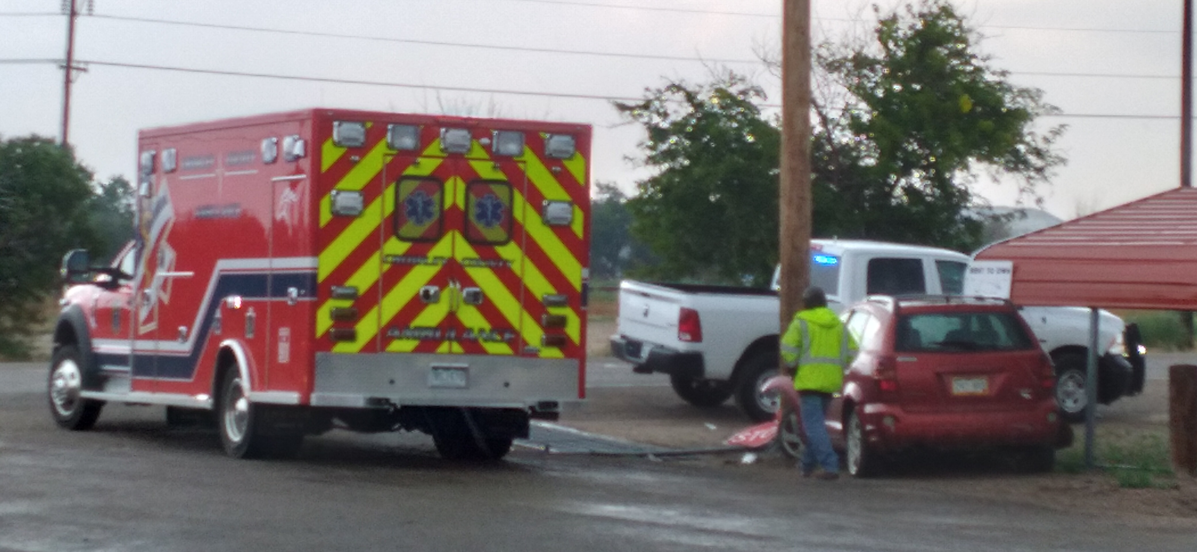 While traveling Northbound on 2nd street a red Pontiac hatchback struck a light pole and stop sign in Fowler at the intersection of 2nd and Cranston Ave. At about 4:30pm Wednesday afternoon. The Crowley County Ambulance pictured was there by coincidence.