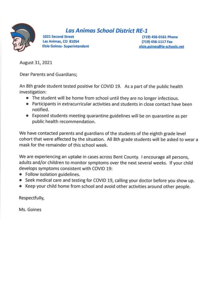 On August 31st, 2021, Las Animas Schools reported that an 8th grade student has tested positive for COVID-19.