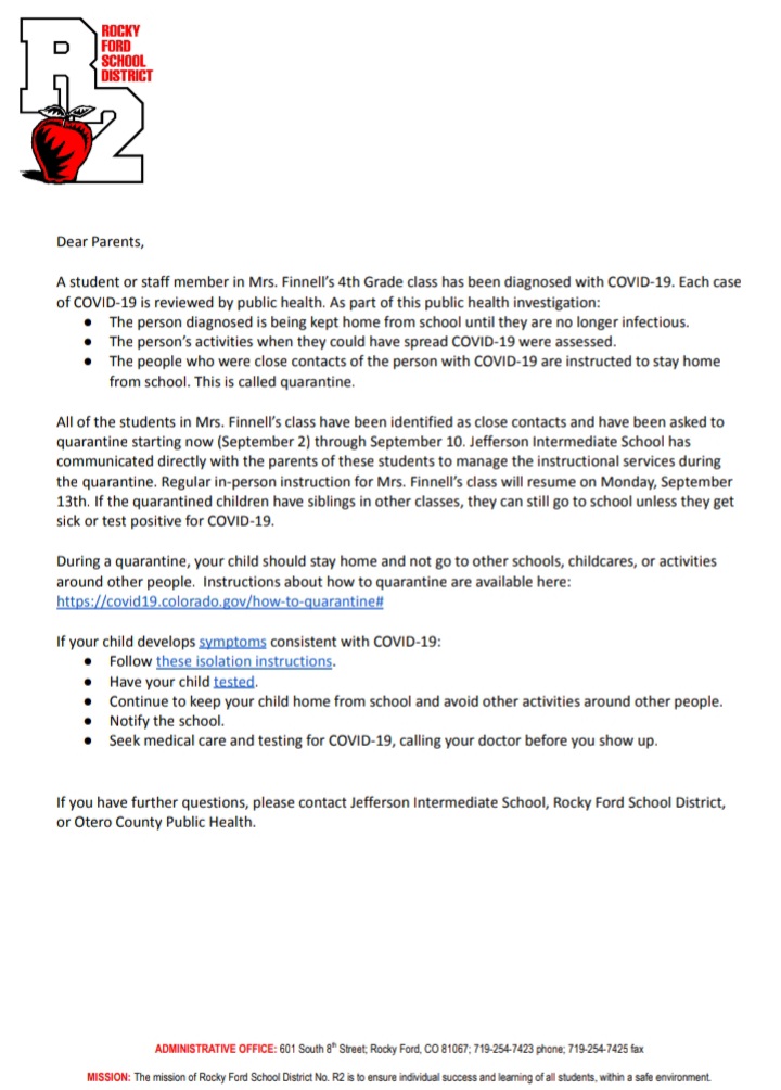 Description: The Rocky Ford School District Announced on Social Media that Mrs. Finnells 4th grade class has tested positive for COVID. All of Mrs. Finnells class has been identified as close contacts and are required to quarantine through Sep. 10.