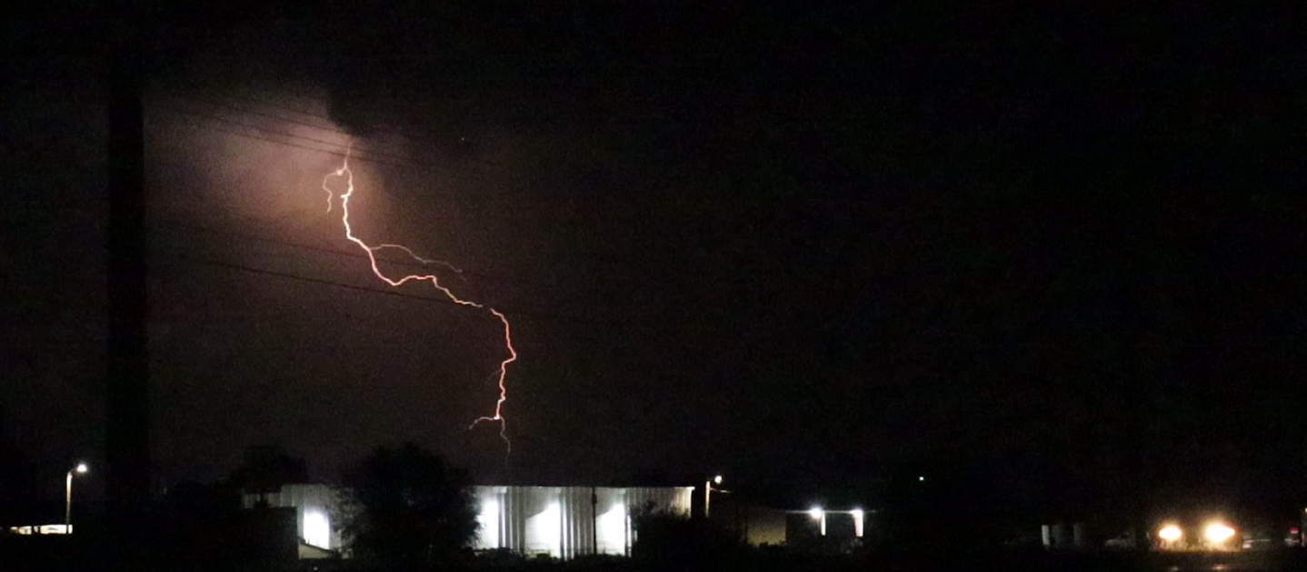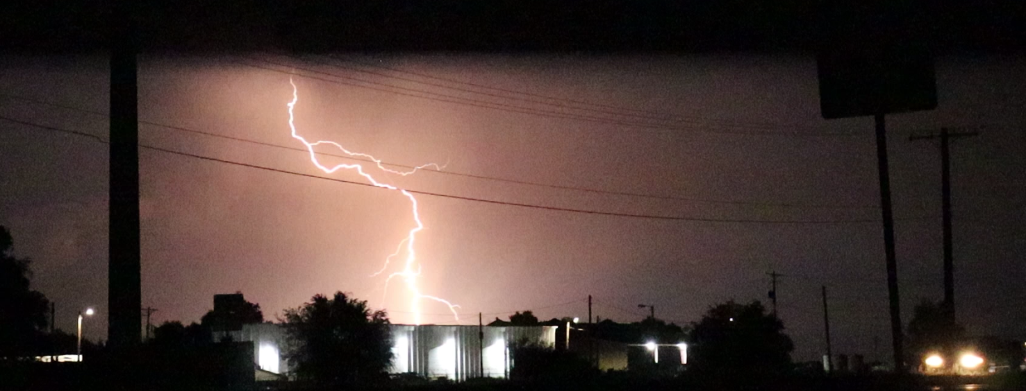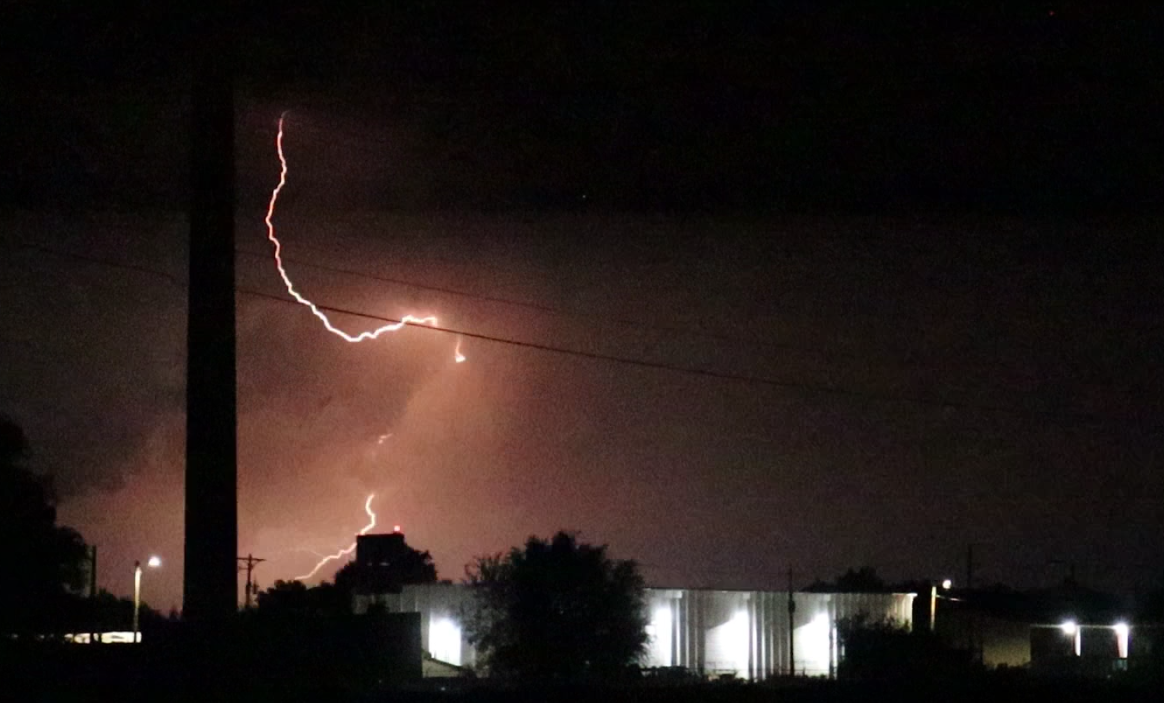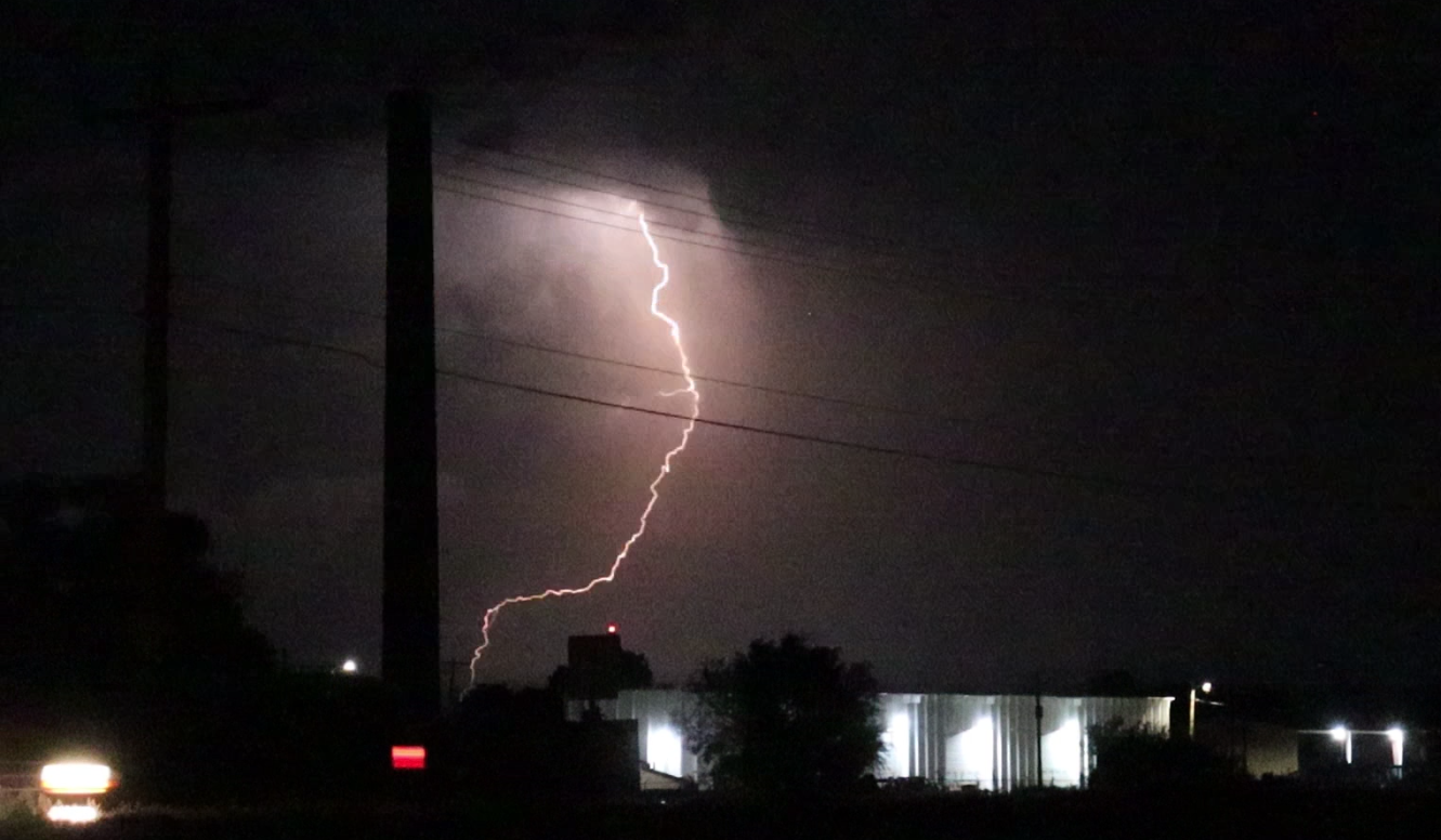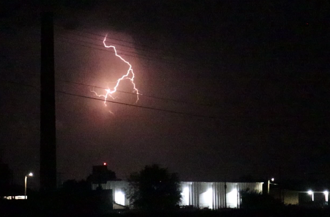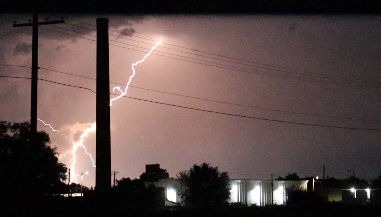 Description: Lightning Strikes in a late Summer Thunderstorm Northeast of the Holly Sugar Tower in Swink.