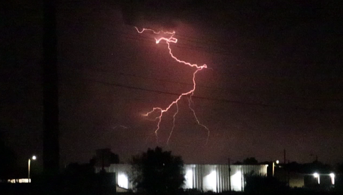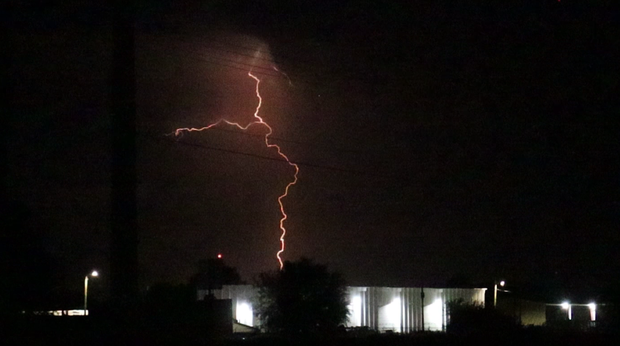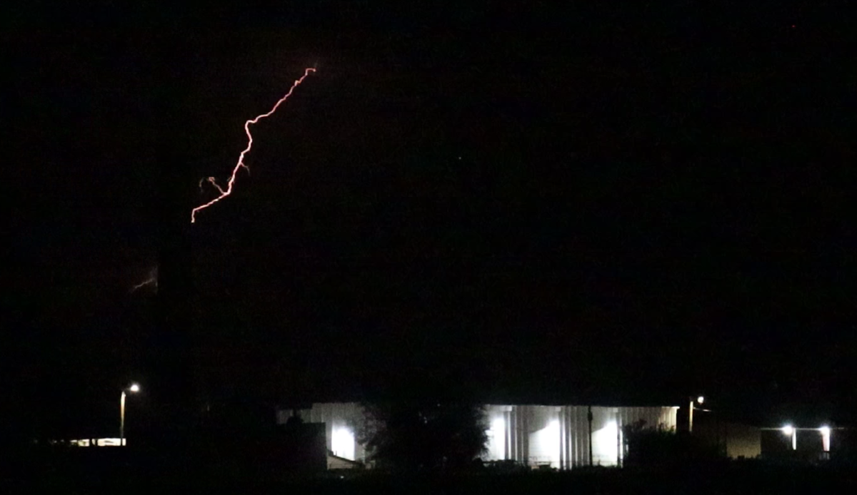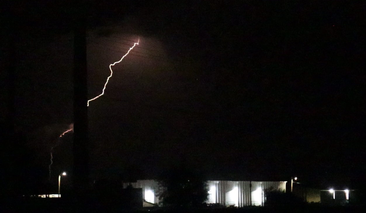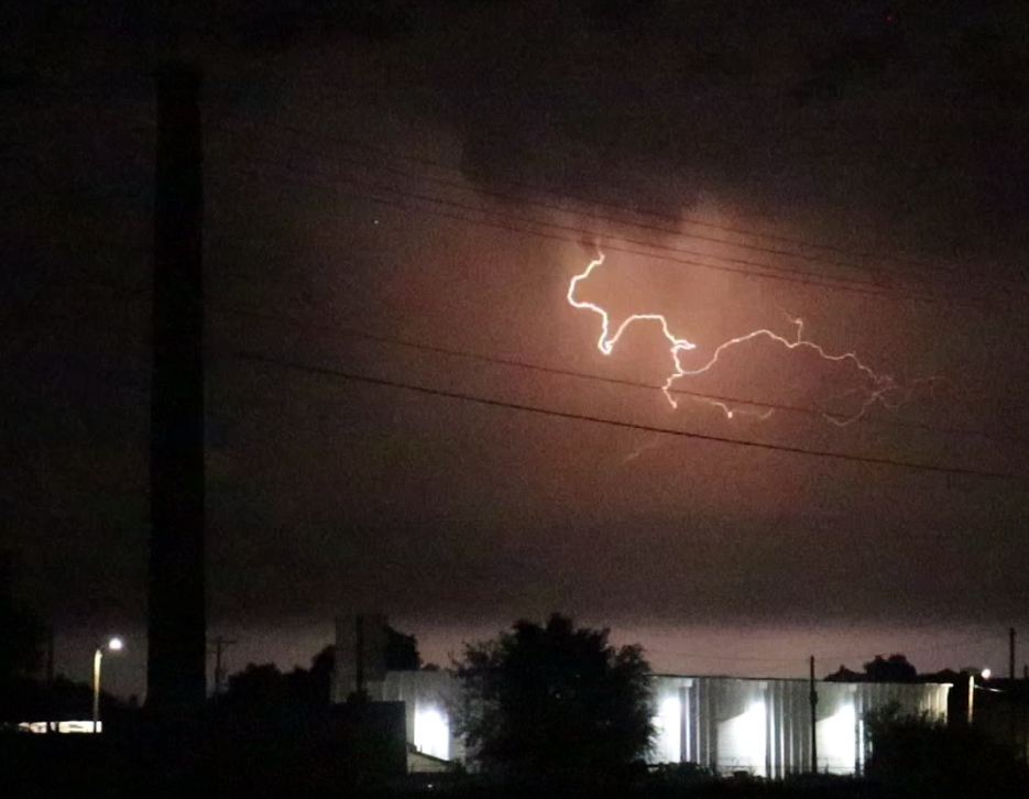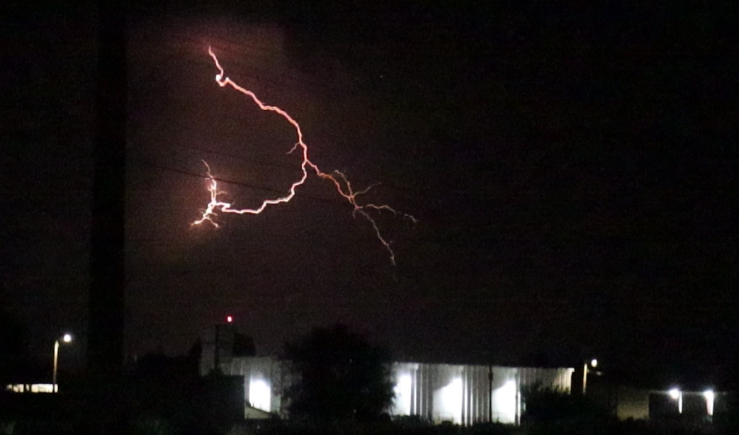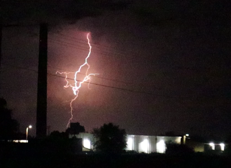 Description: Lightning Strikes in a late Summer Thunderstorm Northeast of the Holly Sugar Tower in Swink.