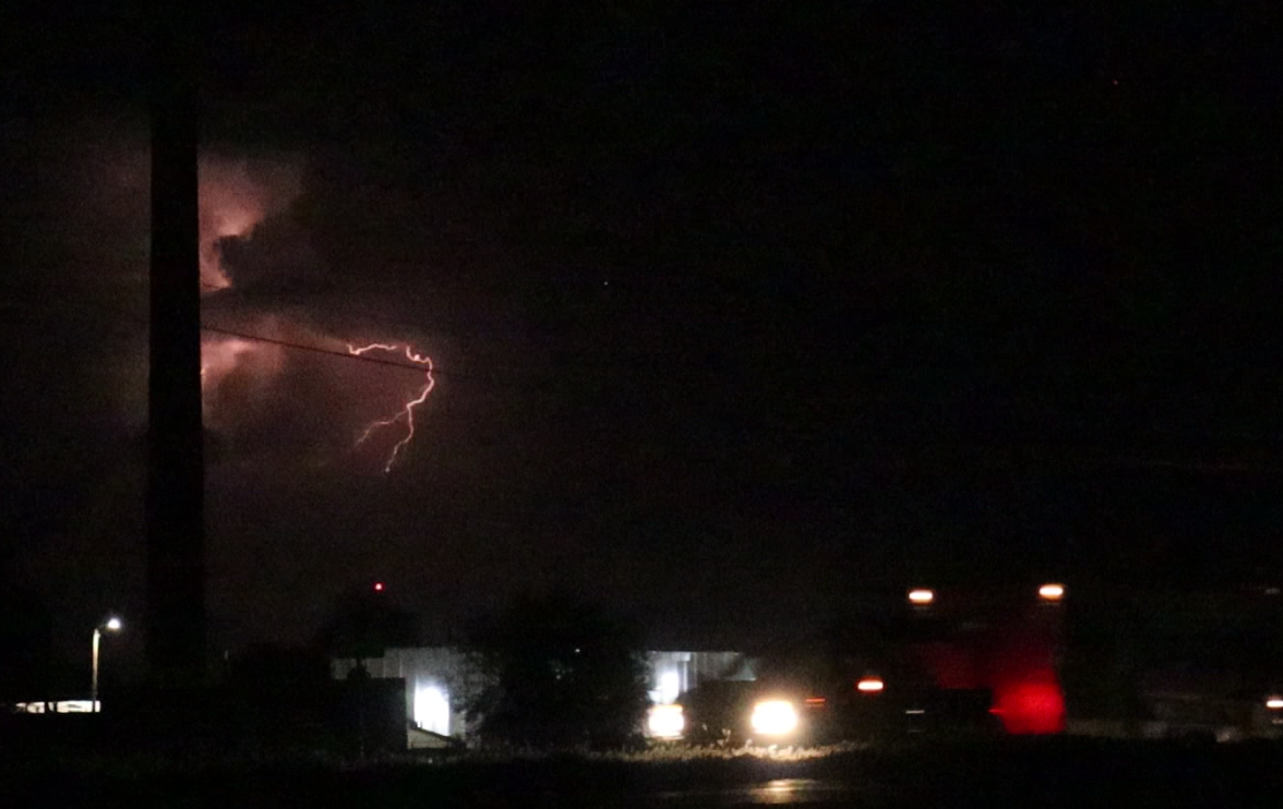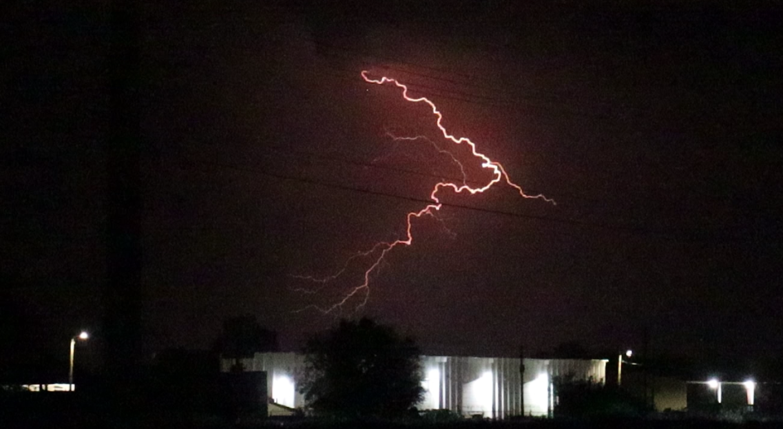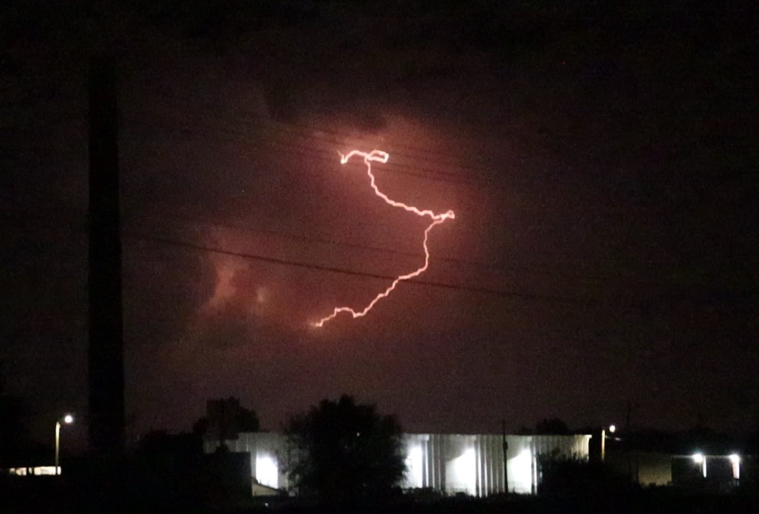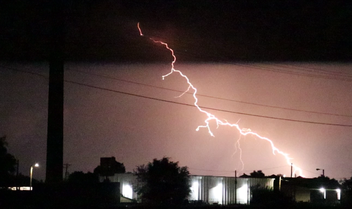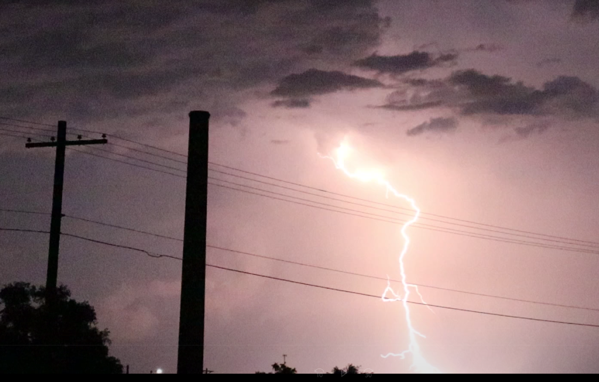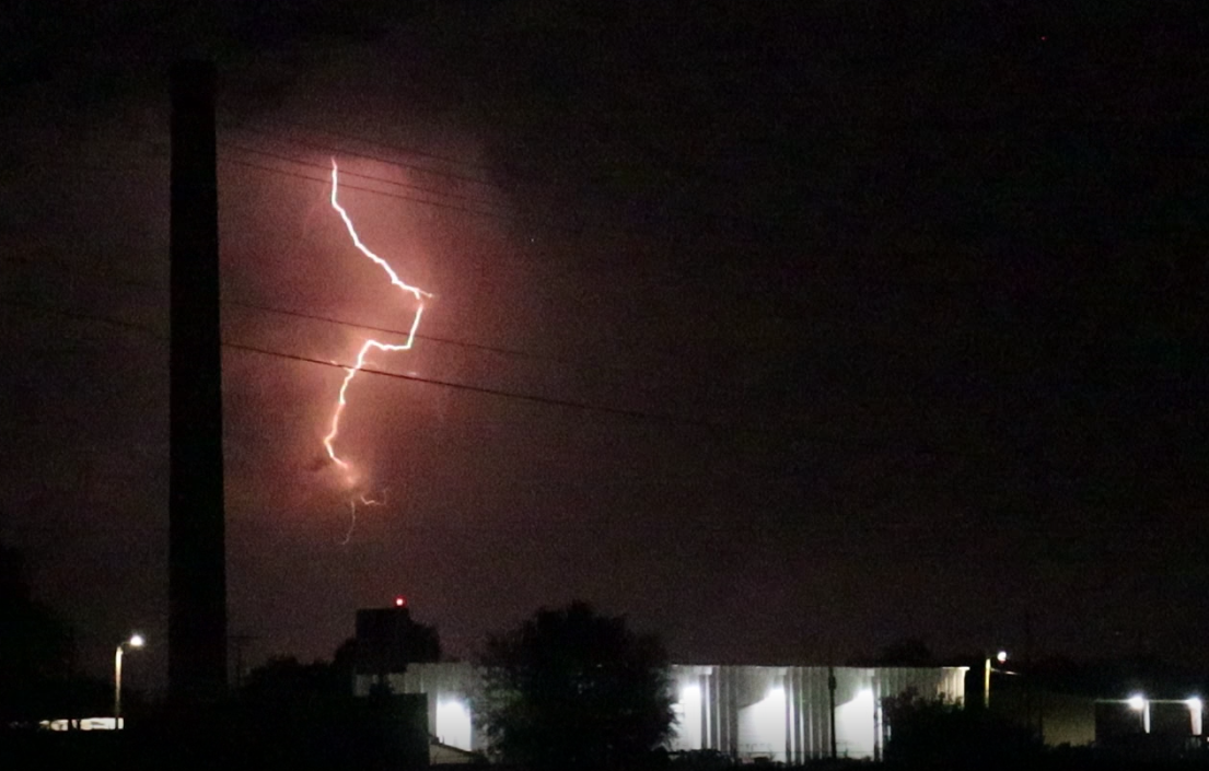 Description: Lightning Strikes in a late Summer Thunderstorm Northeast of the Holly Sugar Tower in Swink.