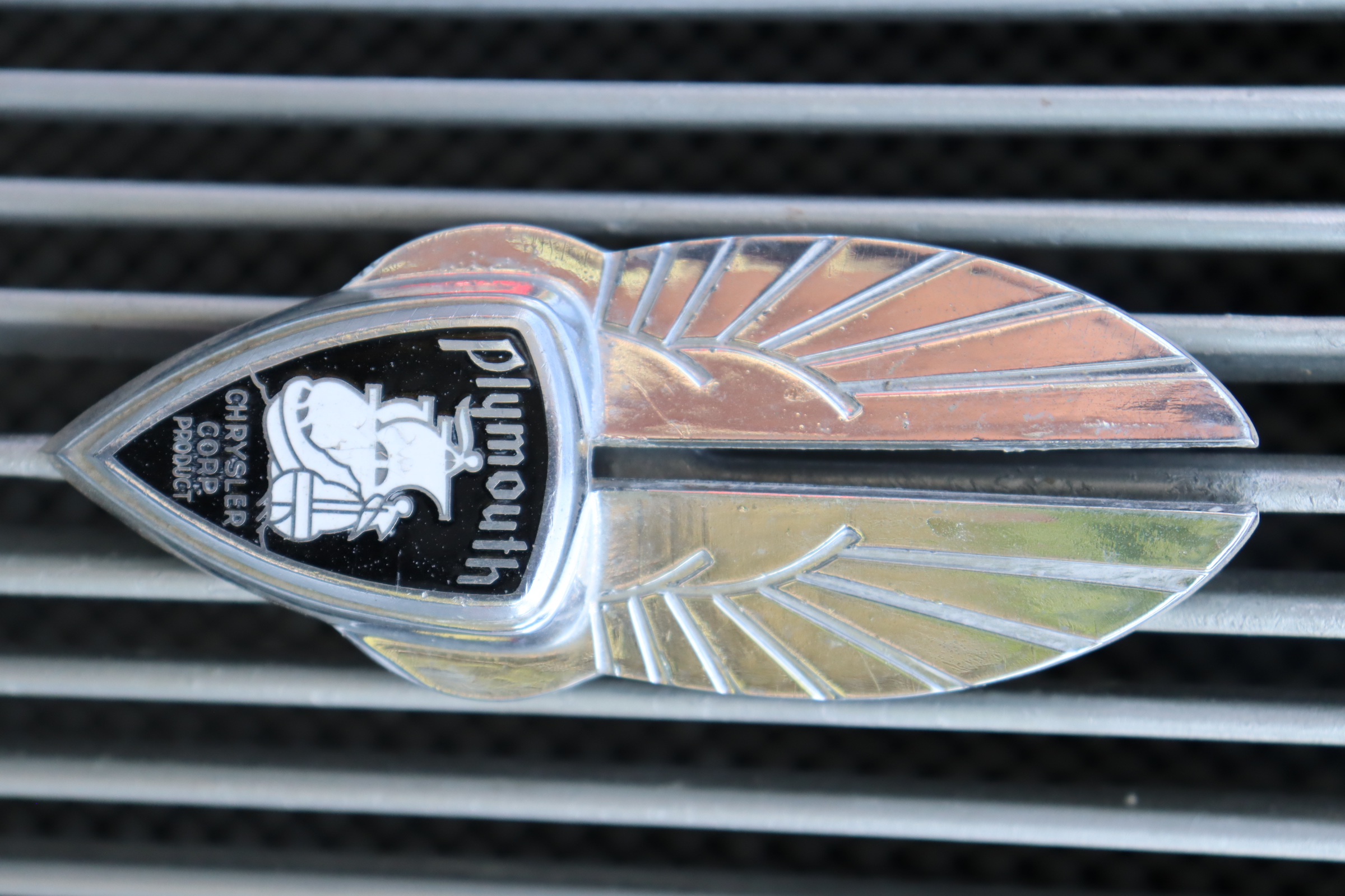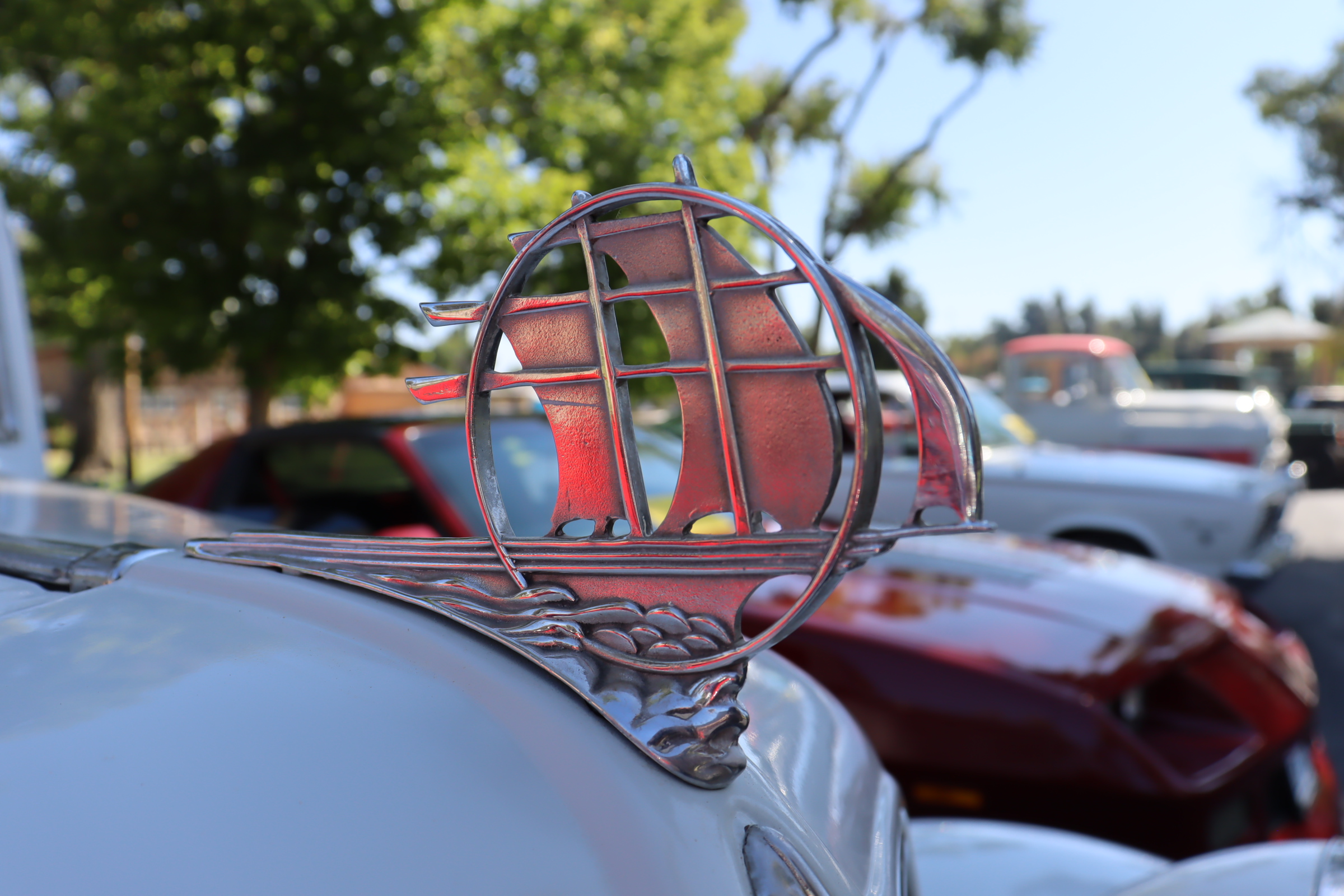 Description: This classic Plymouth hood ornament depicts a ship at sea; classic cars and trucks can be seen lined up along the city park wall.