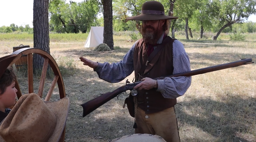 Description: A Saint Vrain & Company Hunter Demonstrates How To Properly Load a Flint-Lock Rifle During the Santa Fe Trail Bicentennial Symposium at Bents Old Fort National Historic Site in La Junta, Colorado.
