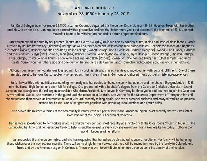Jan requested that she be cremated, and she has requested that her ashes be distributed to several locations. Her family will be honoring those wishes over the next several months. There will be no single formal service, but there will be memorials held by the family in Colorado and Texas and by the American Legion in Colorado. Those who wish to contribute in her name can do so to the charity of their choice.