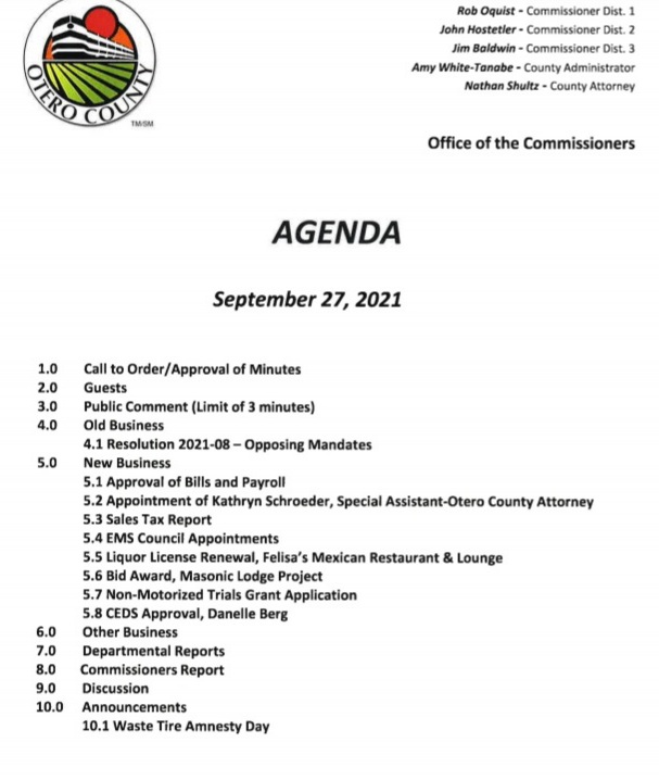Description: Otero Commissioners Pass Resolution 2021-08 Concerning Mask & Vaccination Mandates at their public hearing September 27, 2021.