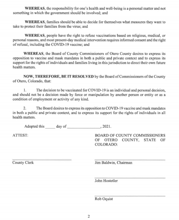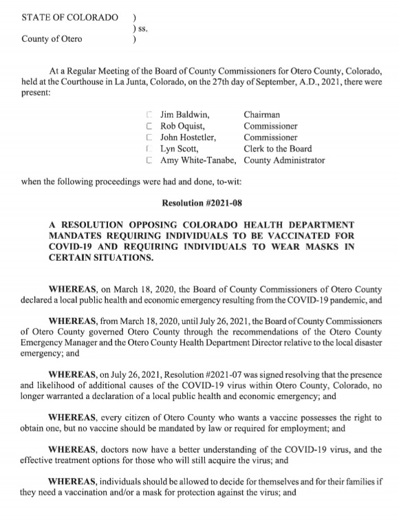 Otero Commissioners Pass Resolution 2021-08 Concerning Mask & Vaccination Mandates