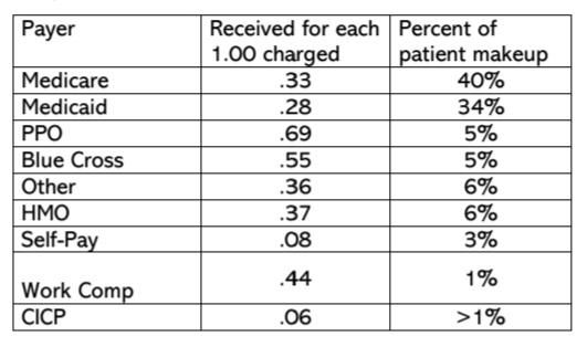 Most of the income for AVRMC comes from Government sources, that being Medicare and Medicaid. The table below shows what is received from each group for each dollar charged and what percentage that group makes up of our patients.