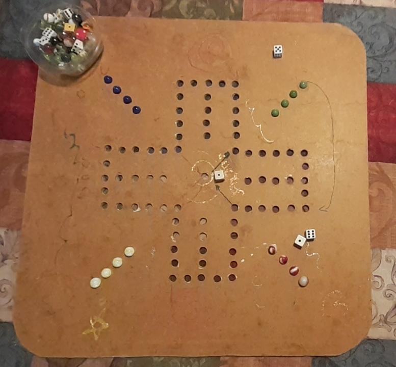 Lets start with an all time family favorite of ours. As far back as I can remember my family has been playing Marbles. It is a game much like “Sorry” or “Aggravation,” but played on a home made board with four different colored marbles. Grandpa made boards, my mom and her siblings grew up playing, in turn all the grand kids grew up playing. My sister and I even taught our friends to play. Many hours were spent at family holidays around my grandma's table playing with my cousins and aunts. Now we have taught our kids to play, and we play together as a family.