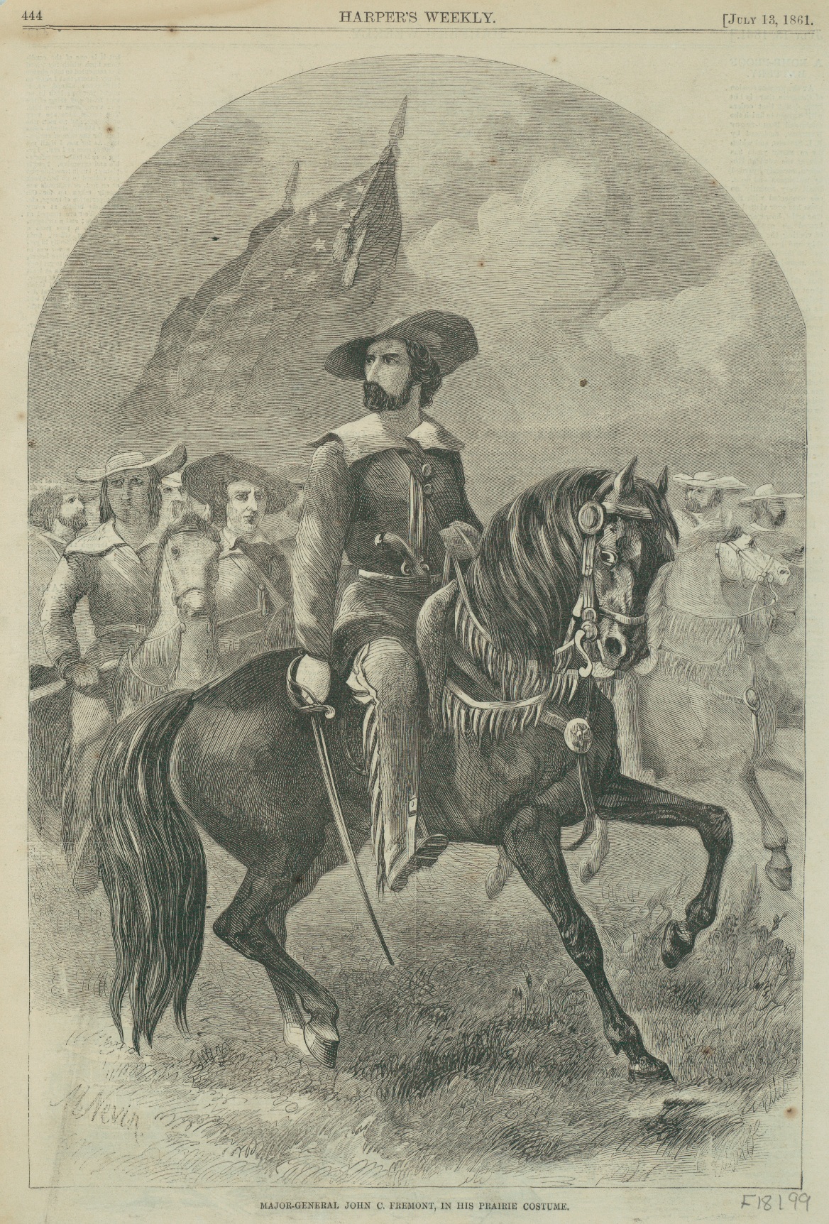 Description: Major General John C. Fremont in his prairie costume illustrated in Harper's Weekly July 13, 1861. [Courtesy of the Western History Department at the Denver Public Library; Z-3801]