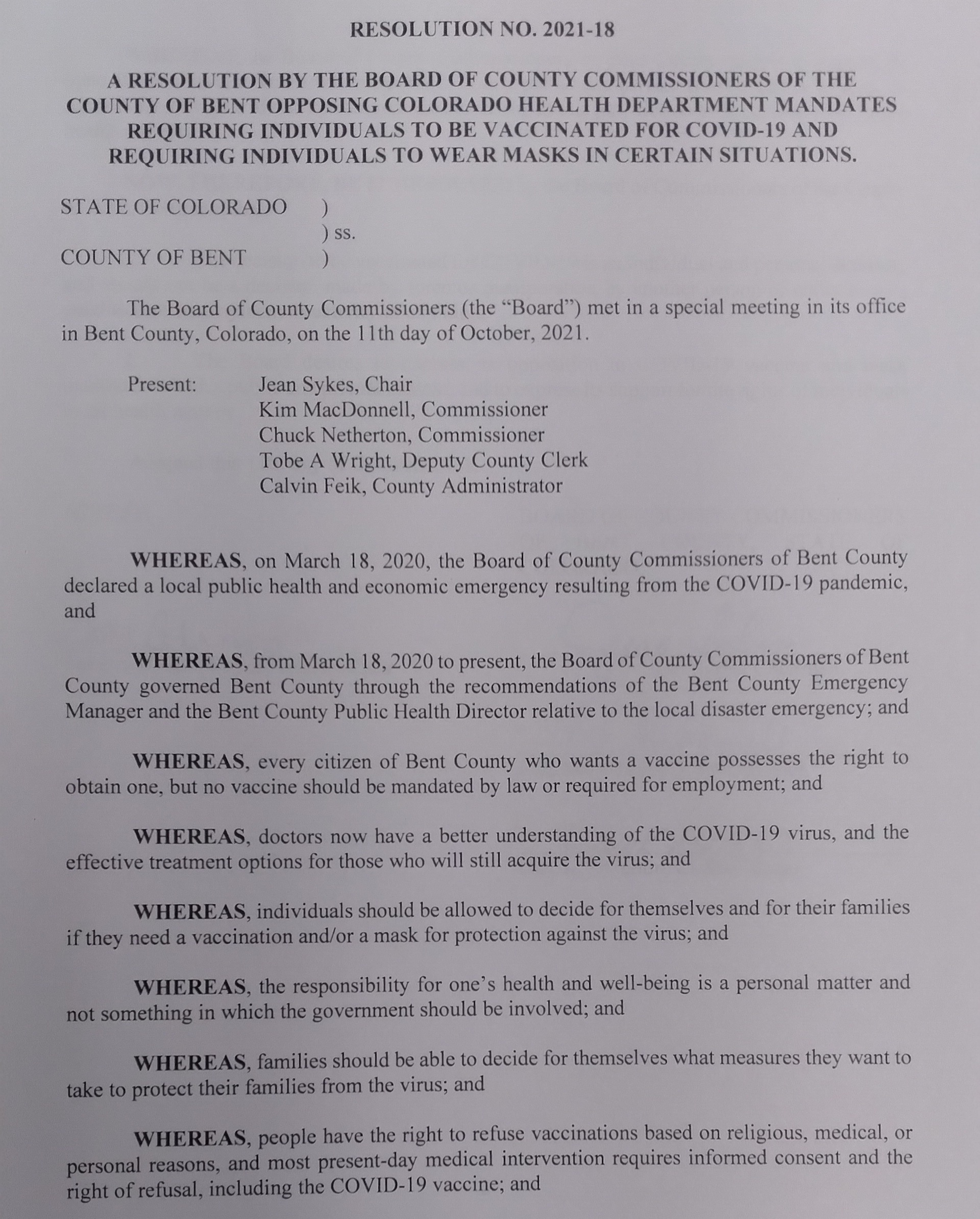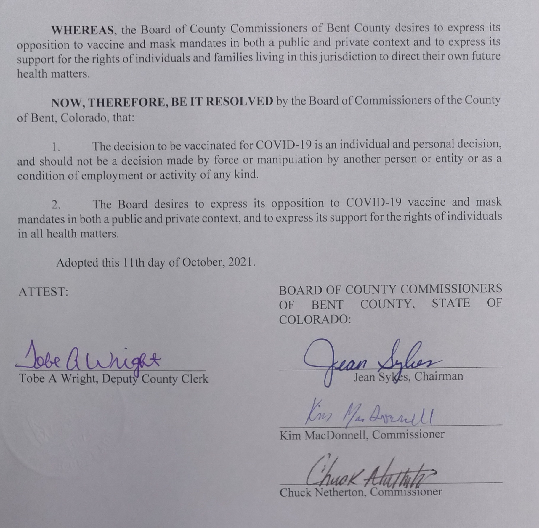 Bent County Commissioners Adopt Resolution 2021-18, Opposing State Health Mandates
