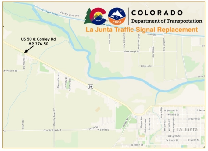 OTERO COUNTY- The Colorado Department of Transportation and contract partner Arrow Electric have started a signal replacement project at US 50 and Conley Road in La Junta. Work will include the removal and installation of traffic signal equipment, poles, mast arms and vehicle detection upgrades at the intersection. Additional work includes removing and installing curb, gutter, and Americans with Disabilities Act (ADA) ramps. The new ramps will be in compliance with the Public Right of Way Accessibility Guidelines (PROWAG) requirements.