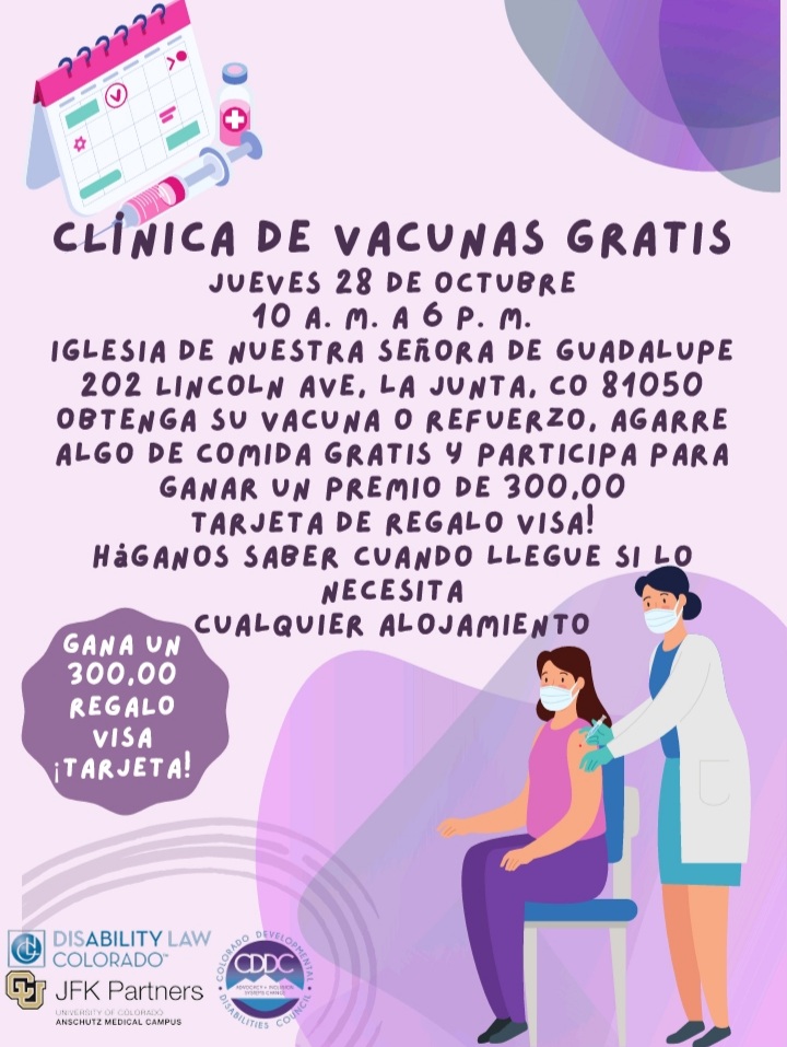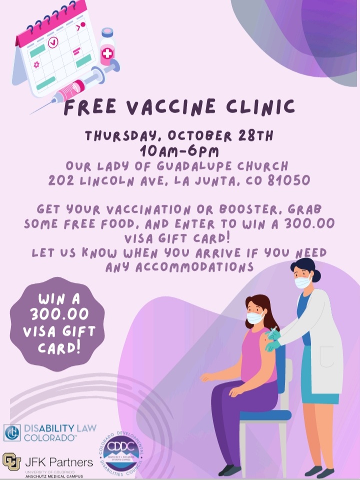 Description: Free Vaccine Clinic Thursday, October 28 from 10am-6pm at Our Lady of Guadalupe Church in La Junta. Get your vaccination or booster, grab some free food, and enter to win a $300.00 Visa Gift Card.