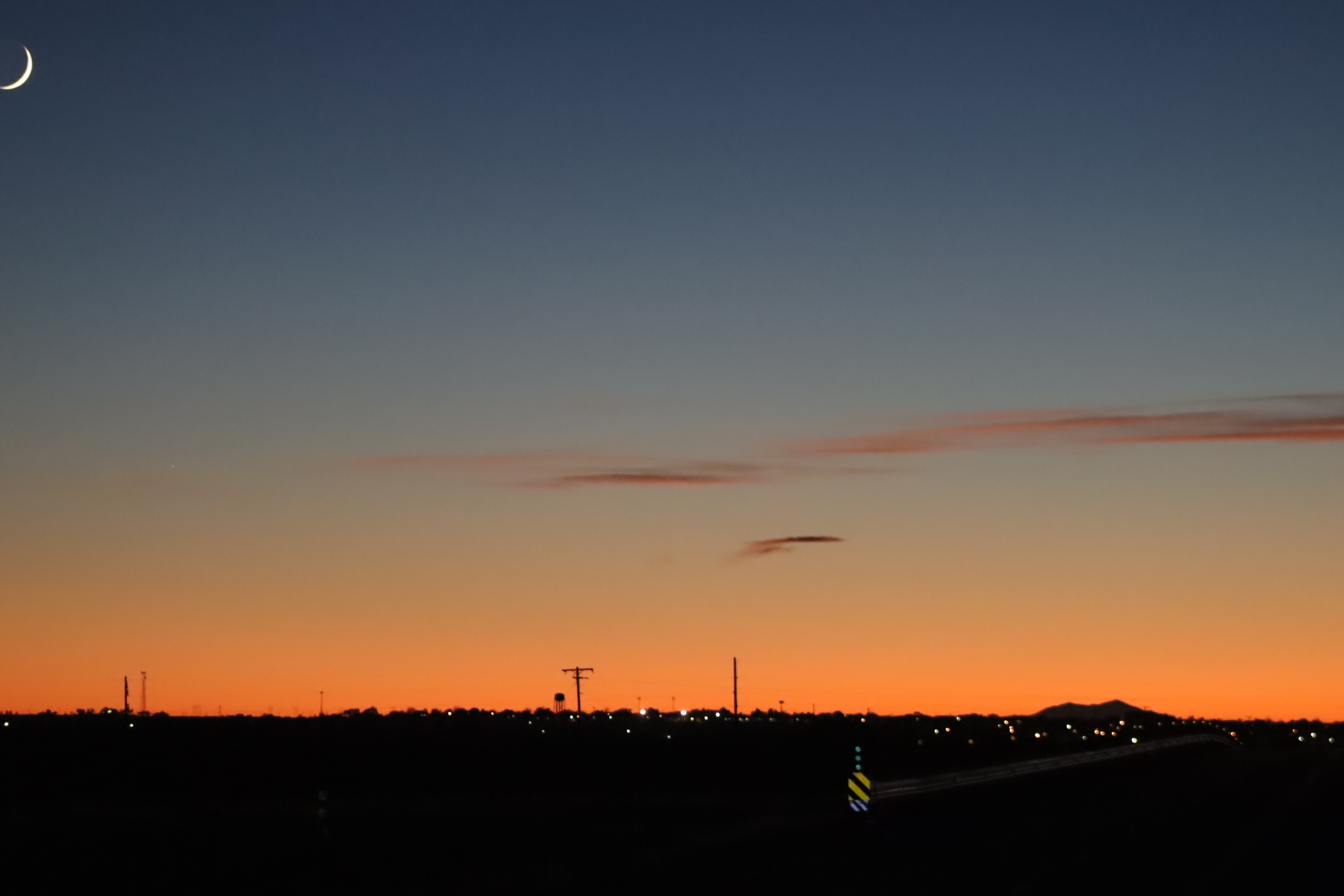 Twilight on Hwy 50 with the glow of La Junta city lights. A car headlight can be seen heading eastbound while a orange and blue sky begins to fade to black. All the while the waxing crescent moon grows each night this month as it reflects the Sun's light for a few brief hours before sinking below the Western horizon.