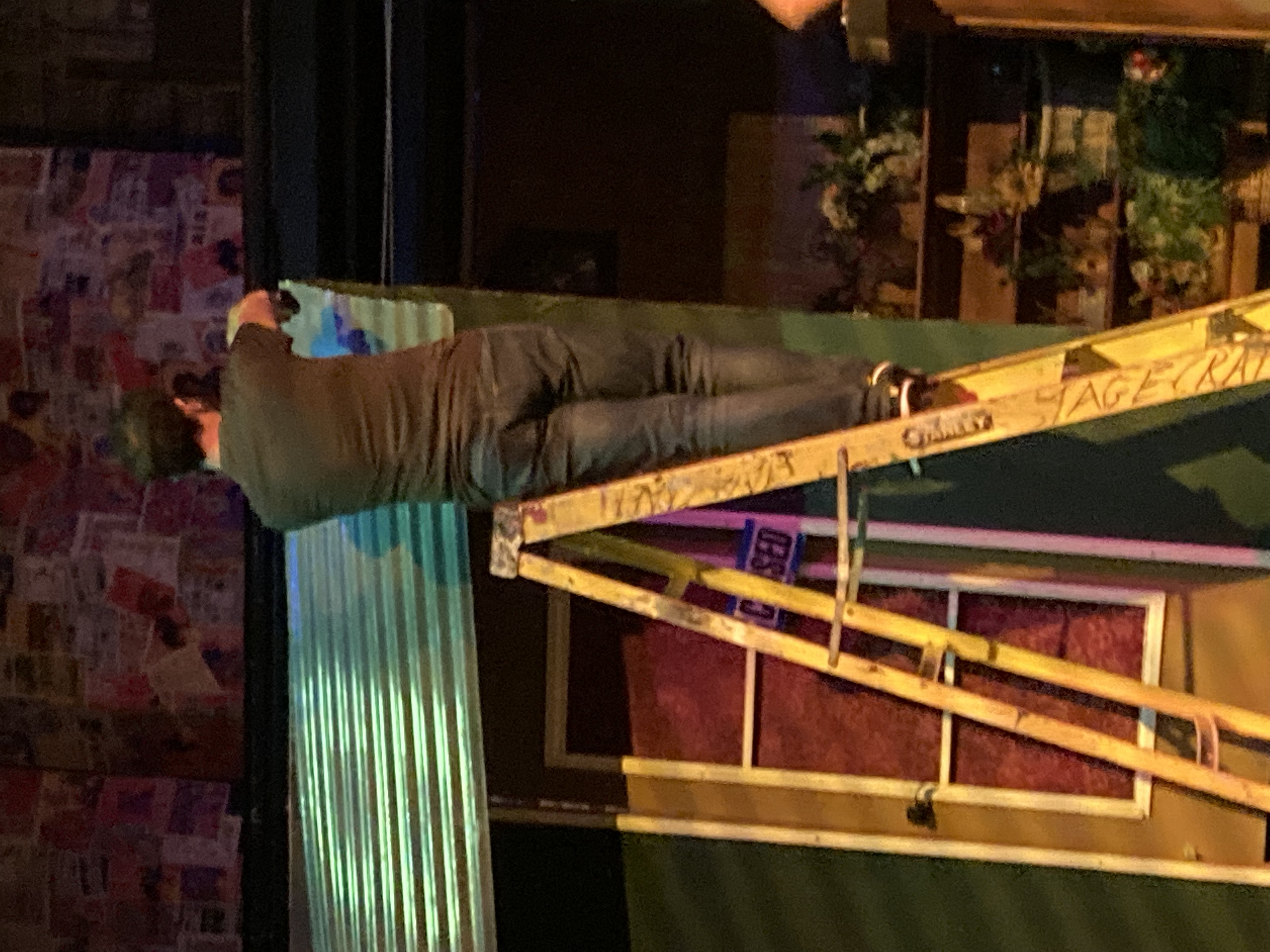 La Junta High School Drama Director Stephen Matthews repairing roof that fell off between acts in dress rehearsal.