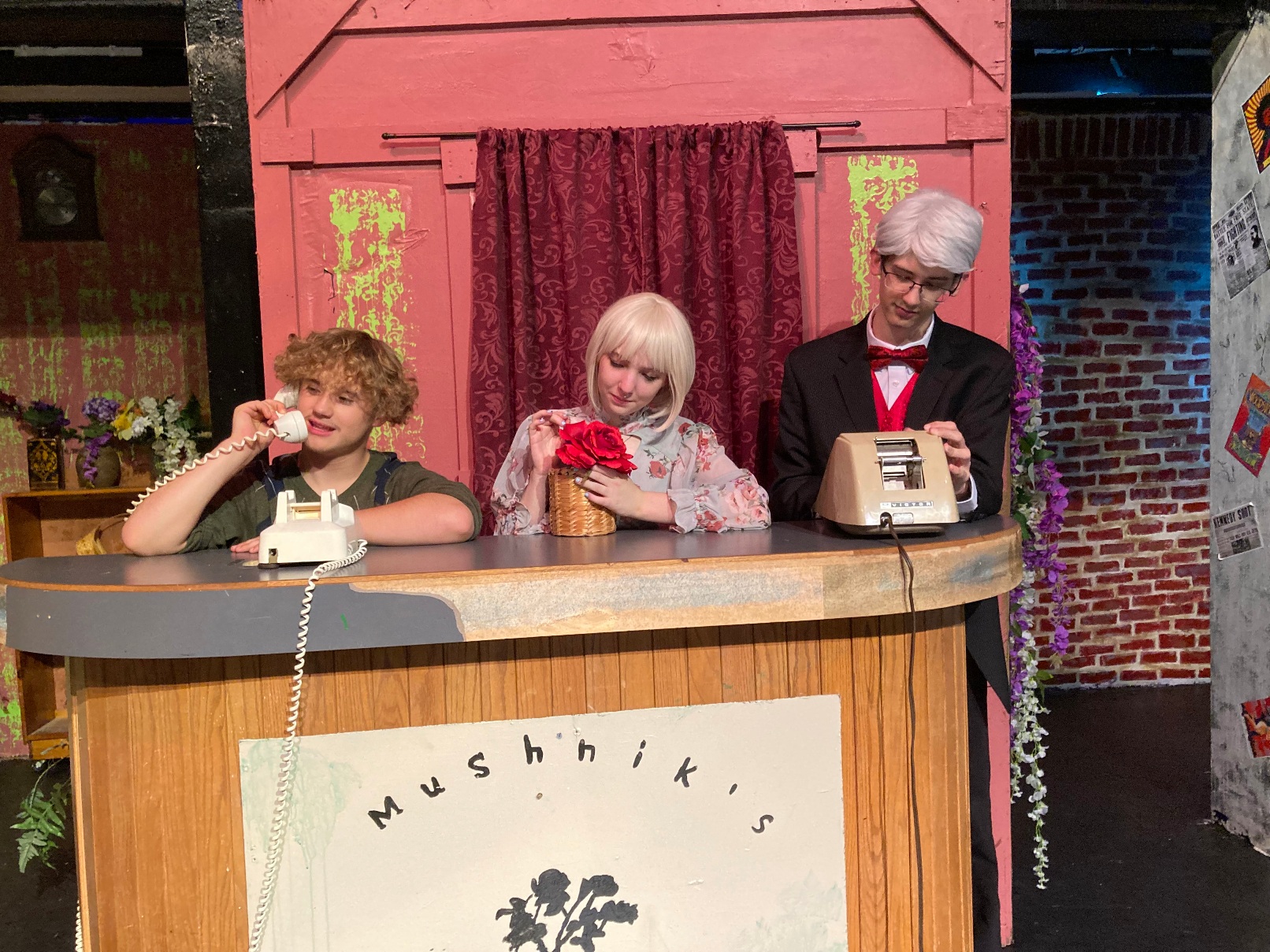 Principals Seymour (Noah Nunez-Rebel), Audrey (Rachel Phillips), Mushnik (Ethan Malec) at the counter of Mushnik’s Floral Shop on Skid Row.