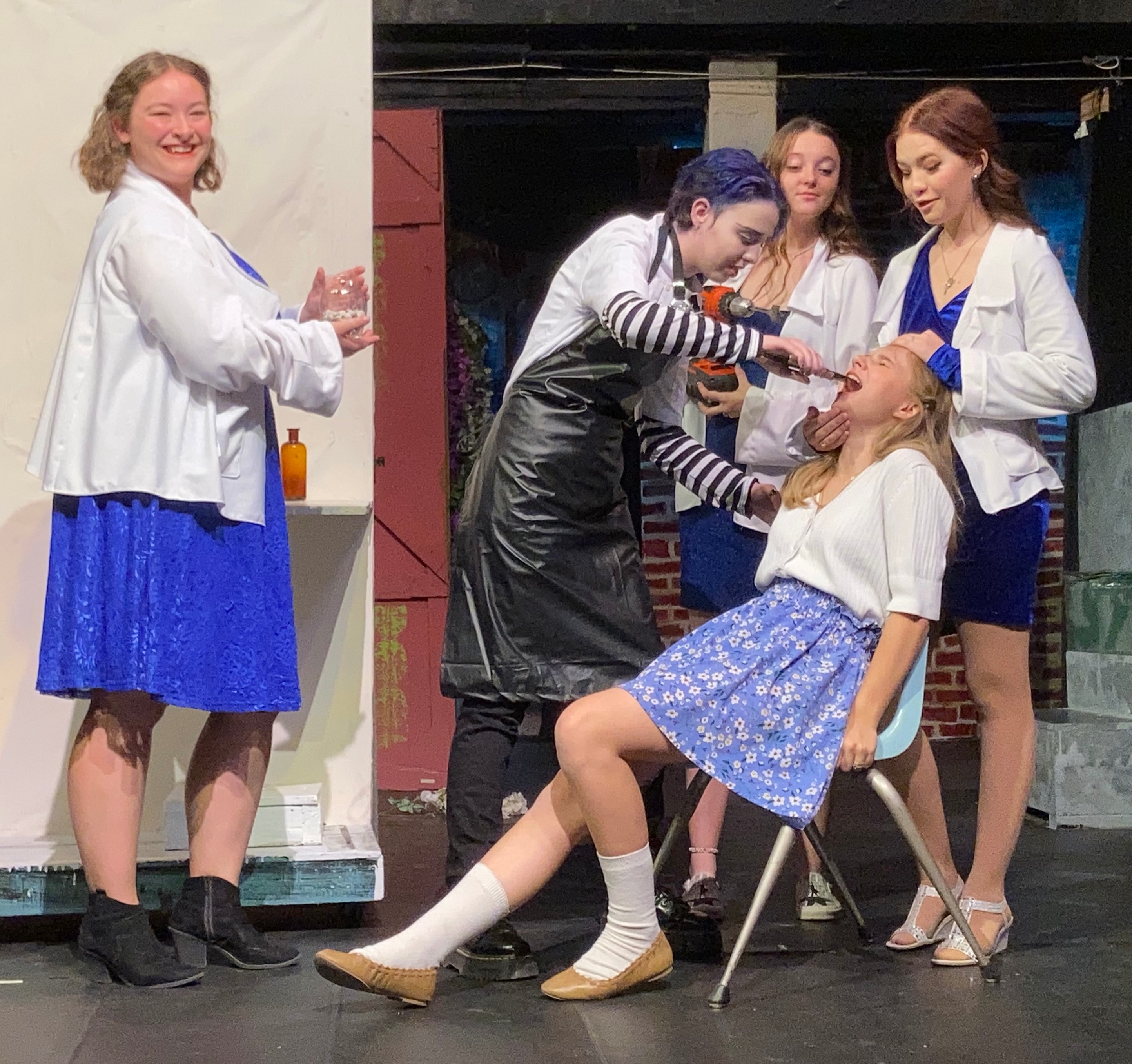 Description: Horror scene in the dentist’s office, left to right: Teagan Summers, Lilly Klein (playing the evil Dr. Orin Scrivello), Lexi Minck, Kaydence Lagergren. Victim: Bethany Taullie. (Photo Credit: Bette McFarren)