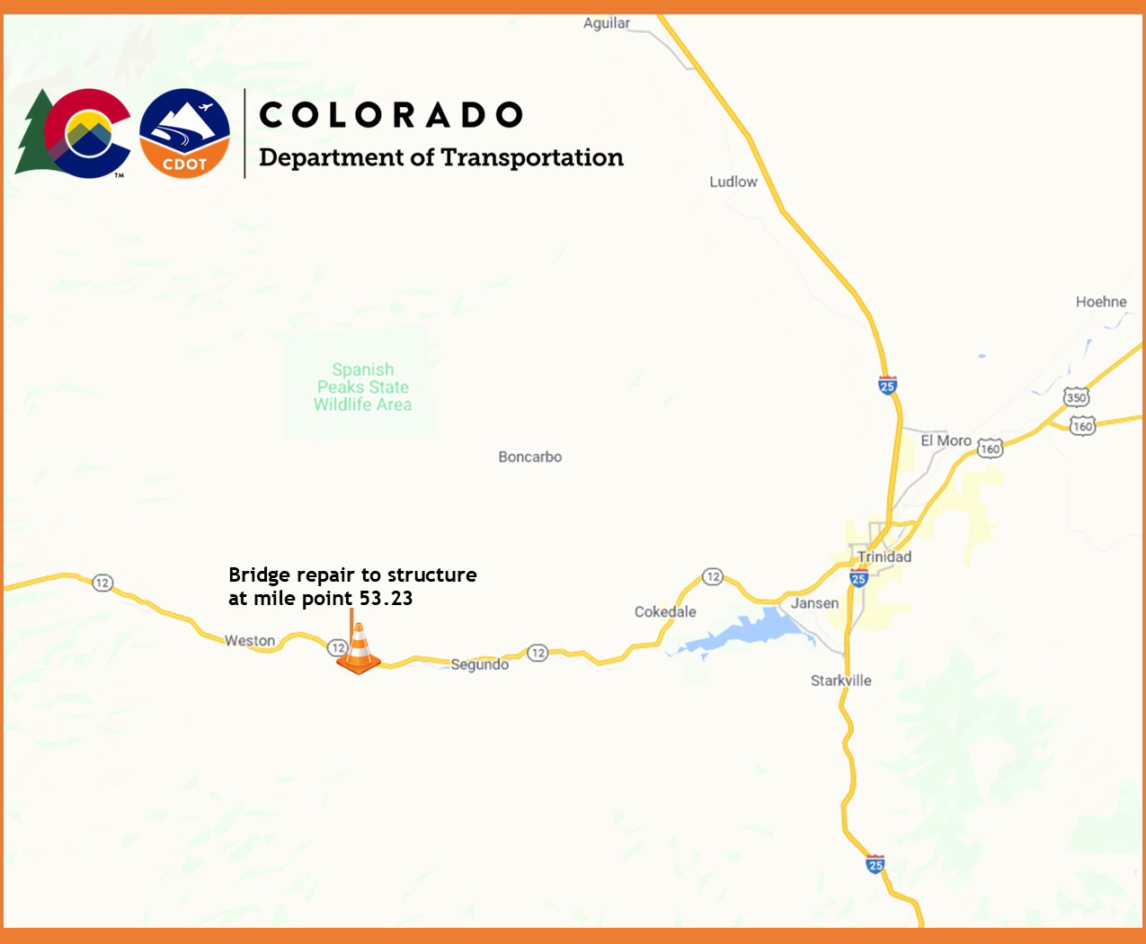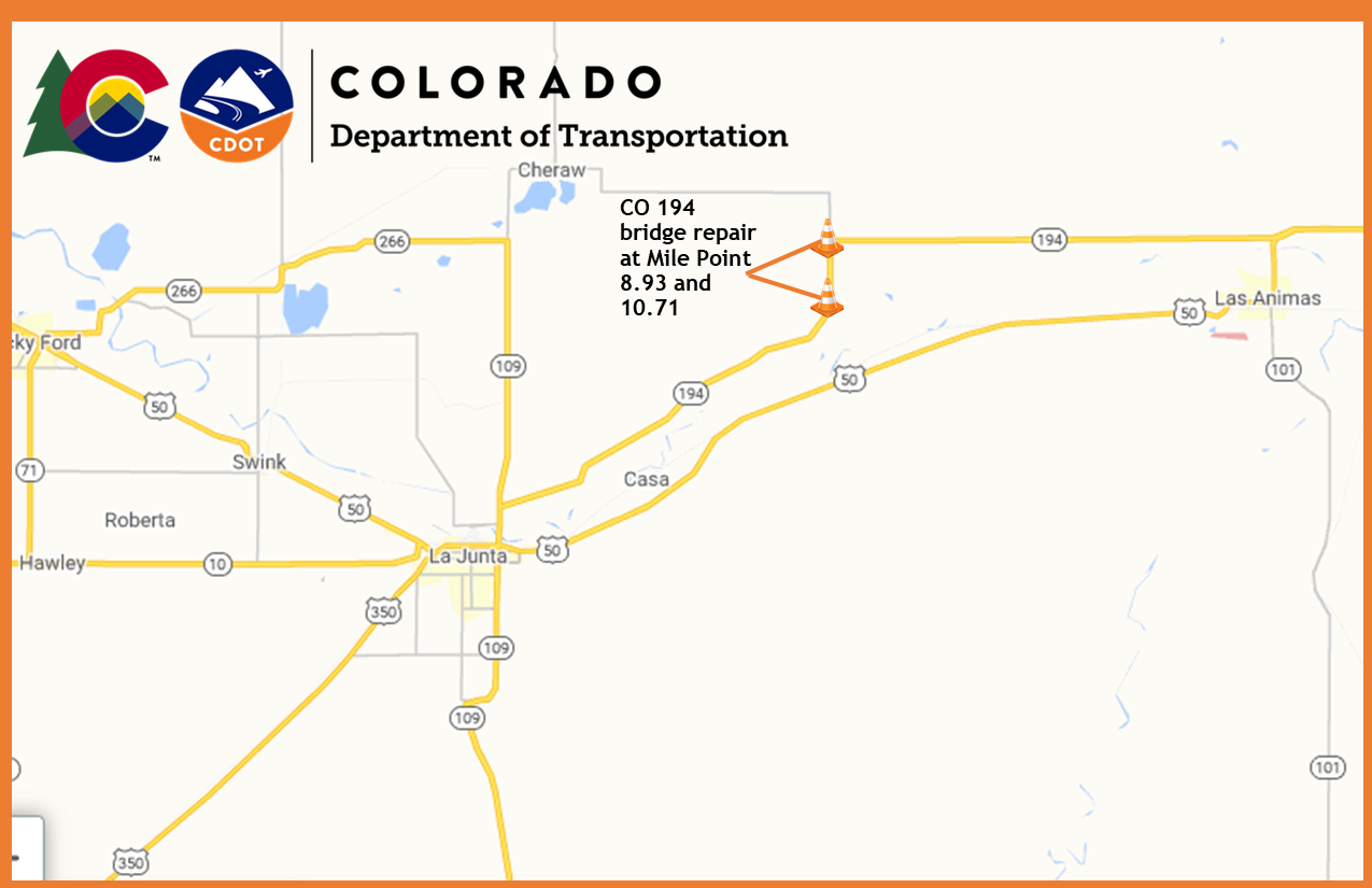 BENT, LAS ANIMAS AND OTERO COUNTIES — Crews started work this week on bridge repairs at three locations along CO 12 and CO 194 in Bent, Las Animas and Otero counties. The project will protect the integrity of bridges by installing materials to absorb the force of the flowing water, thus increasing the lifespan of the structures, and improving their resistance to flood damage and erosion.