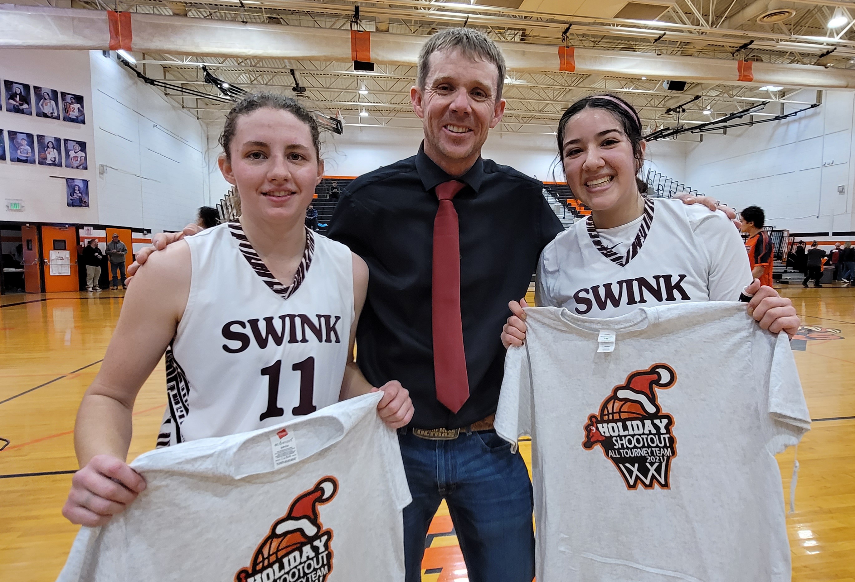 Description: Swink Lady Lions Sydney Larrew and Kate Cabrerra were named All Tournament Athletes at the 2021 Holiday Shootout hosted by La Junta High School. They are pictured with Coach Jace Bauserman.