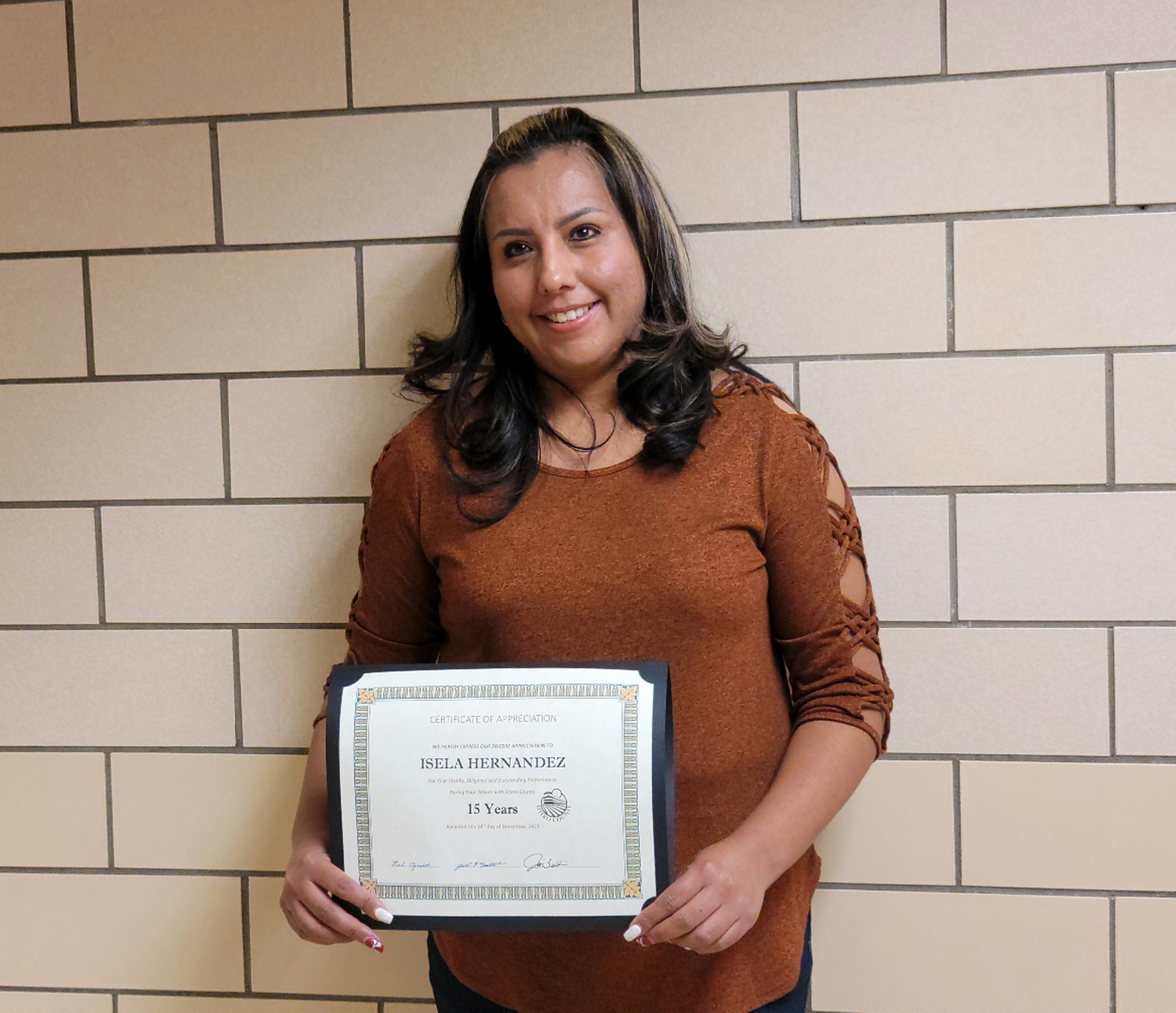 Isela Hernandez was recognized for fifteen years of service with Otero County Department of Human Services.
