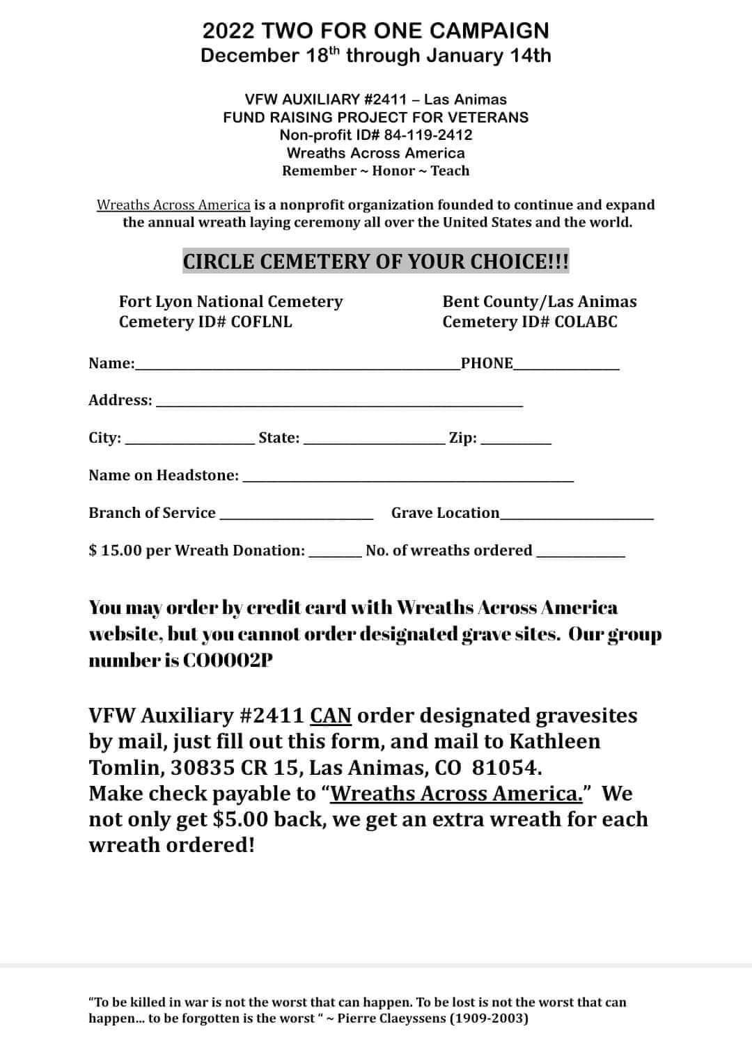 Wreaths may be ordered online at wreathsacrossamerica.org with our group number CO0002P. Online wreath orders may not designate a veteran’s grave, but VFWA can do so. Sale ends January 14th. Forms are available from VFW Members and Kuhns Chiropractic.