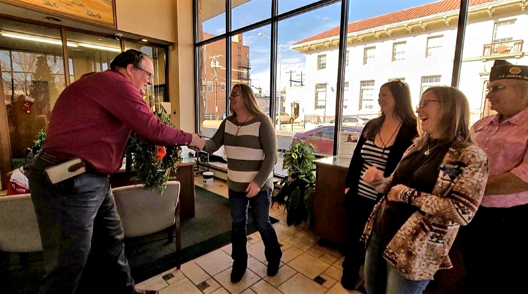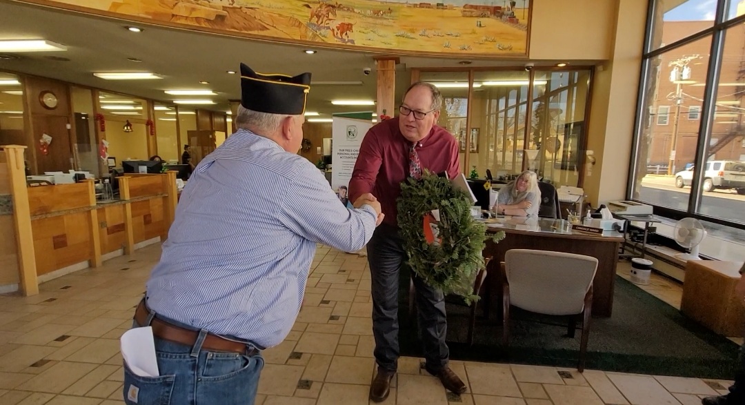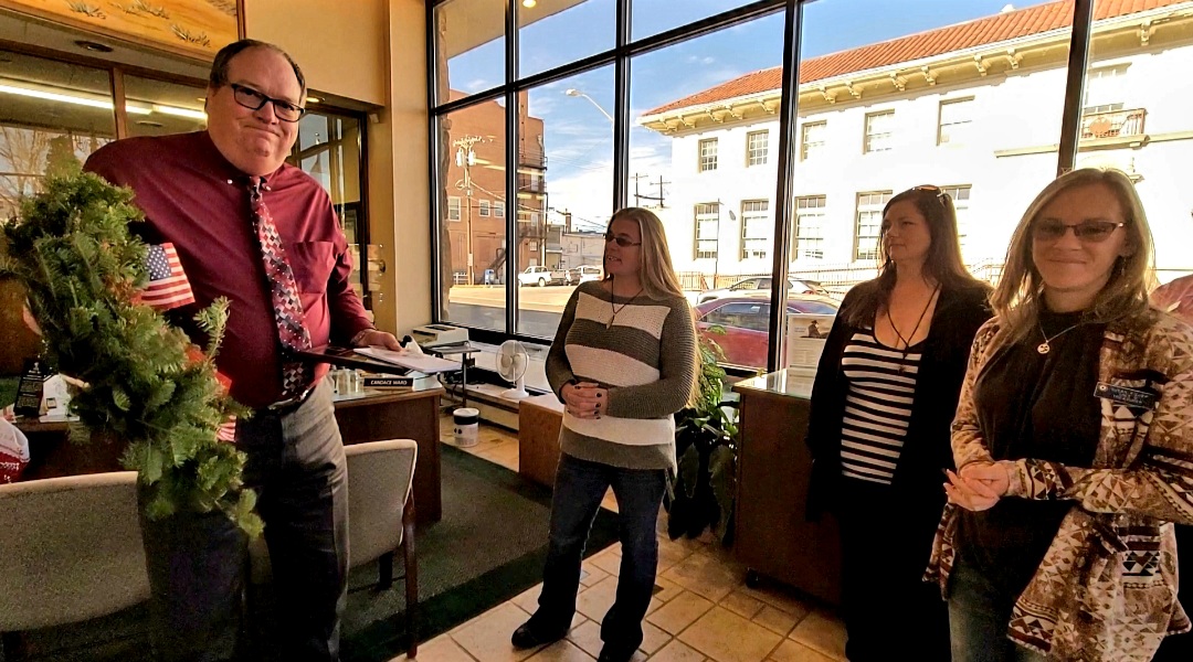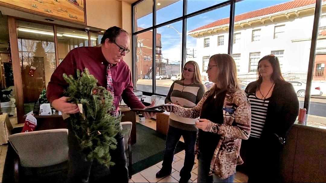 Davis said, "We wanted to come in today and present The First National Bank with this plaque of appreciation for you guys always being a huge supporter for us on our Wreaths Across America, we'd like to give you one of our wreaths as well and just say thank you so much for all you do for us, it was a huge success thanks to you guys. You guys really helped us."