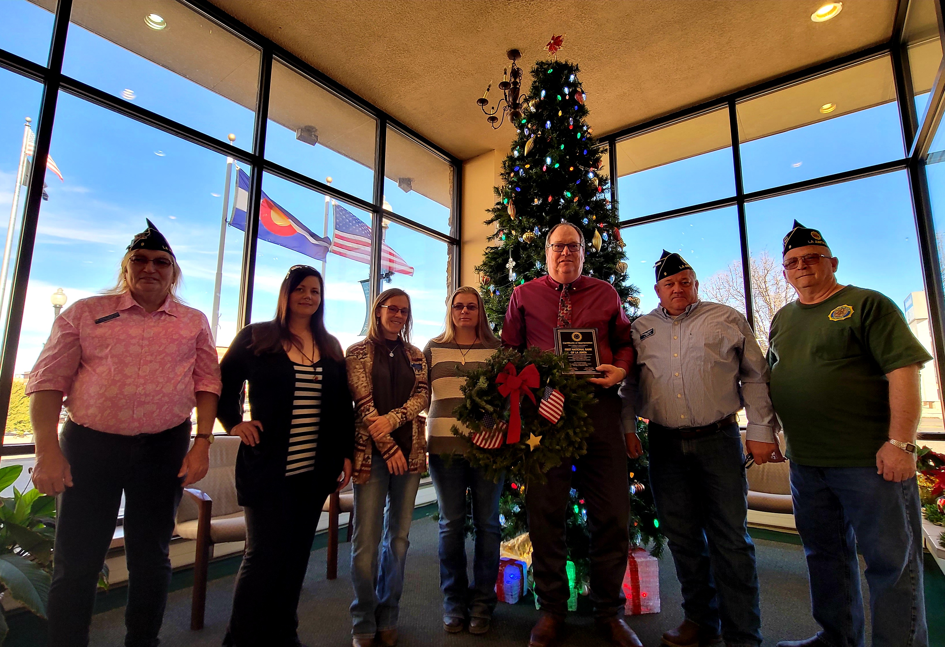 Description: First National Bank of La Junta Vice President Tracy Peppers accepted a wreath and plaque from American Legion representatives Jackie Davidson, Kerri Tomlin, Susan Fisher, Angela Davis, Mike Brodeur, and Ron Tomlin.