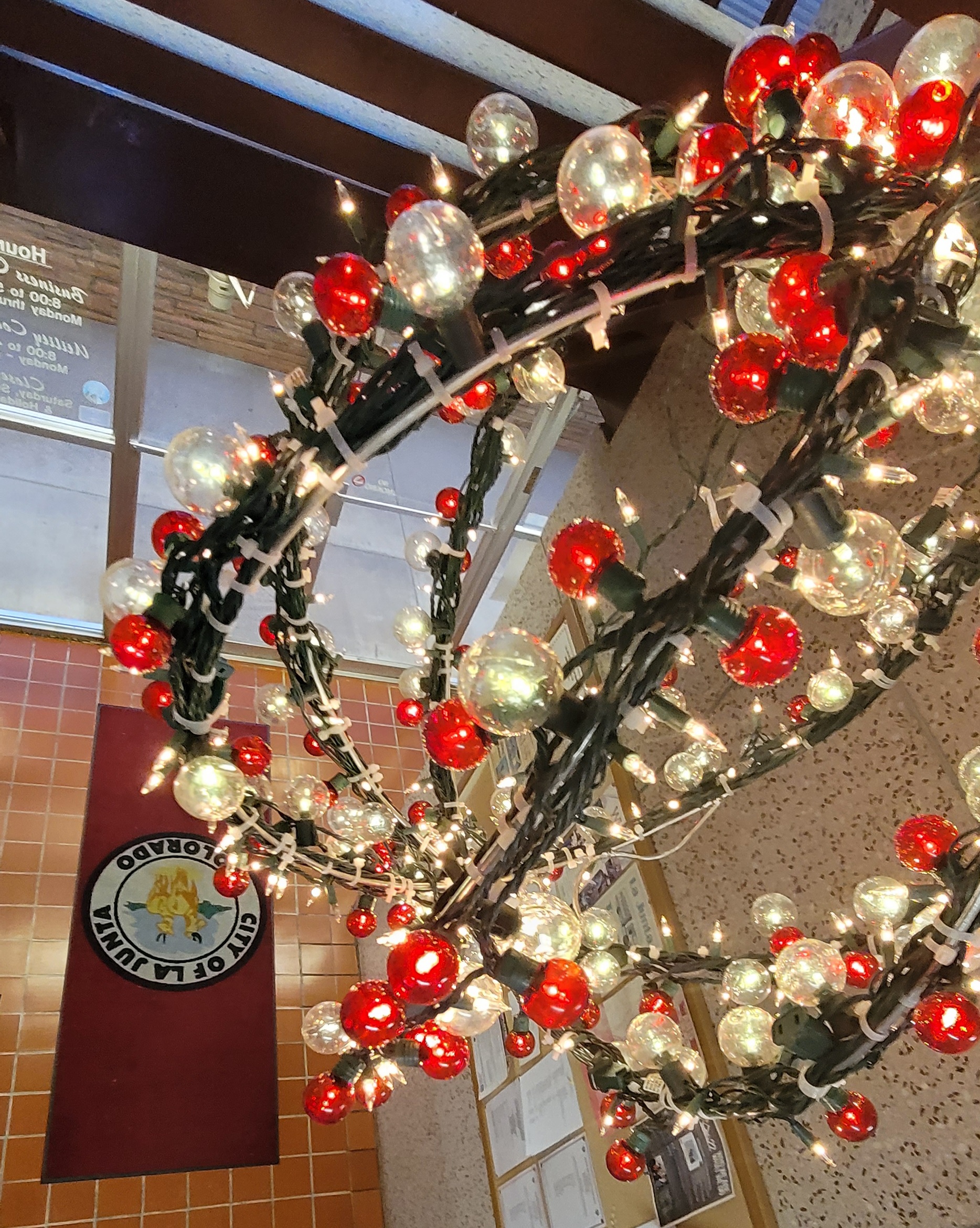 Description: The 2022 La Junta Light Ball hangs in the main entry way of the Municipal Building on Colorado Avenue in La Junta. It can be seen until Monday January 19, 2022.