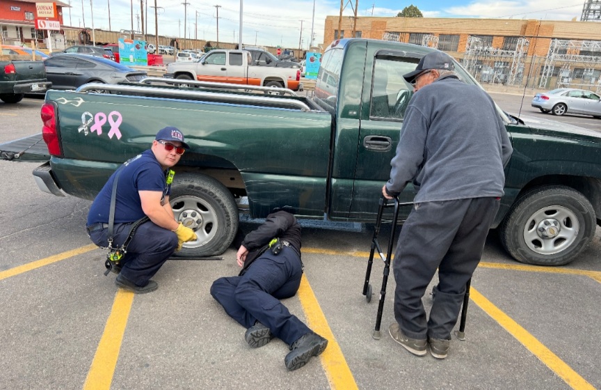La Junta Firefighter/EMTs Steve Elwood and Tyler Swirka assisted an elderly gentleman with a flat tire in the Safeway Parking lot.