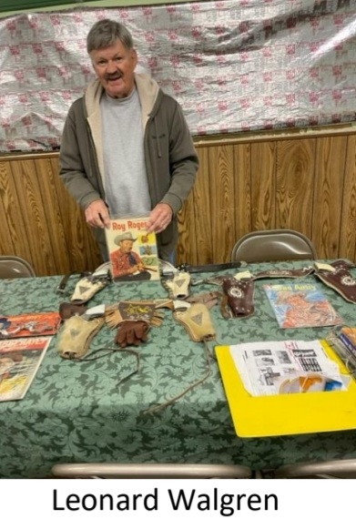 Gary Caldwell brought a die cast ‘55/56 T-Bird which resembles his wife’s car that she drives to this day. And the biggest Roy Rogers fan in the valley is Leonard Walgren with his collection including toy gun/holster sets, gloves and 3 ring binder listing Roy Roger items that he has collected over the years, a pair of Gabby Hayes hand cuffs and magazine, plus a Gene Autry magazine.