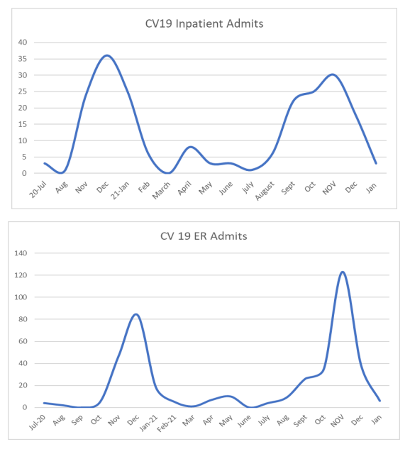 The fourth quarter of 2021 was very busy for the hospital. With the fall season surge of Covid-19, Inpatient admissions were up as well as ER visits. There were 29 CV19 inpatient admissions in third quarter and 73 in the fourth quarter. During that same time, there were 39 ER admissions in the third quarter and 196 in the fourth quarter. January has seen less activity.