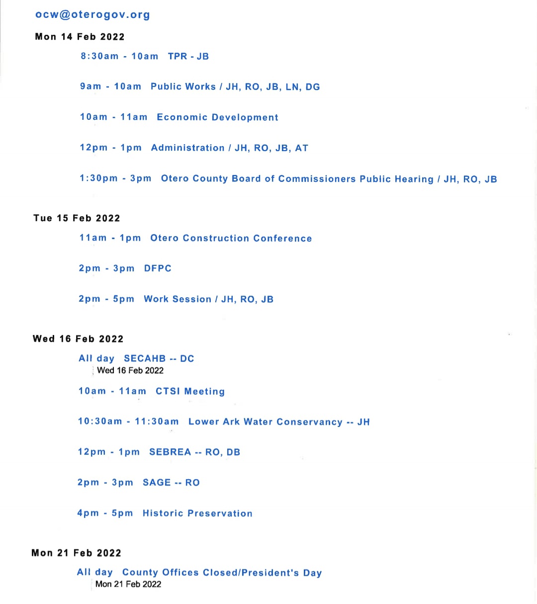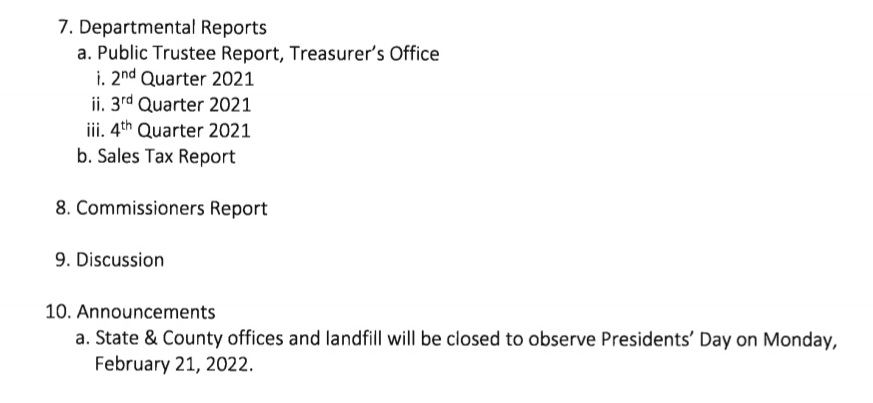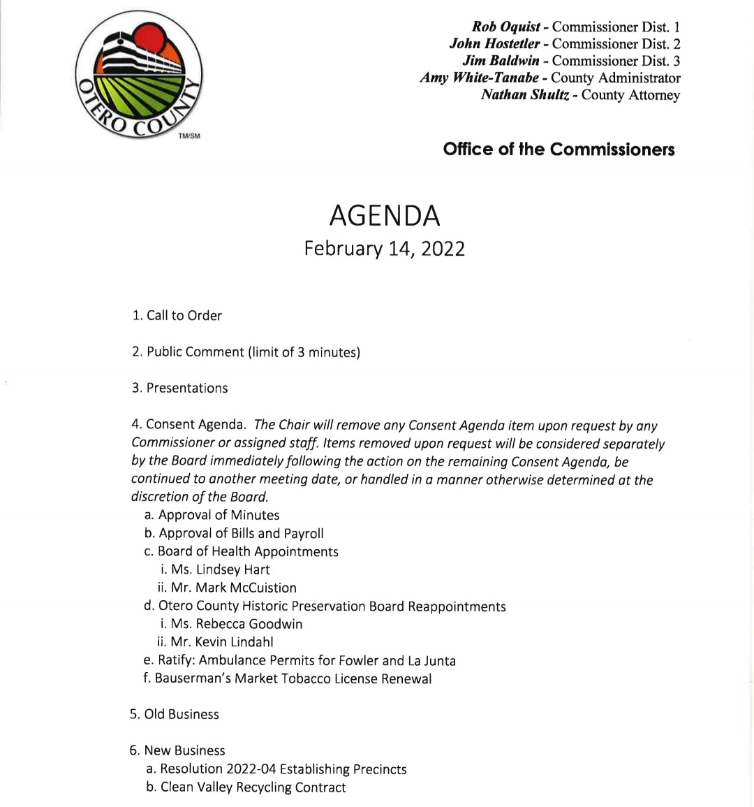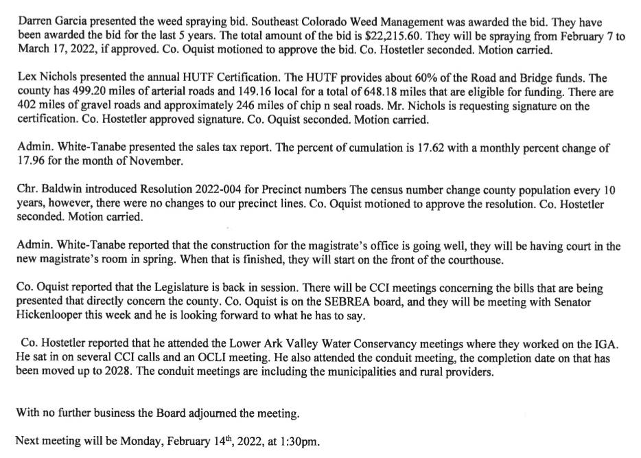 Description: Hit play to watch the Highlight Reel. Article includes: Agenda, Consensus Items, County Tax Report, and other documents from the public meeting held February 14, 2022 in La Junta, Colorado.