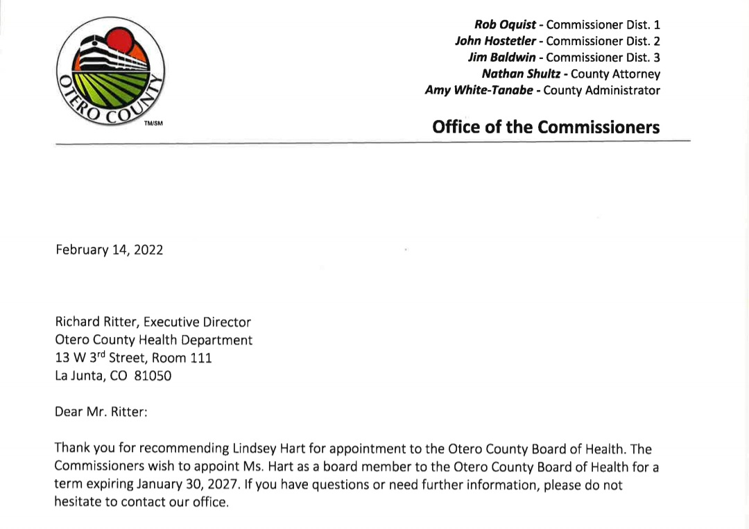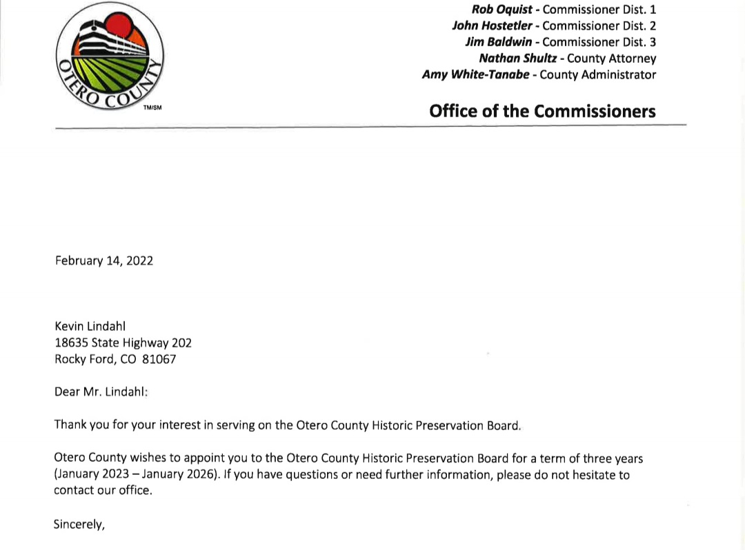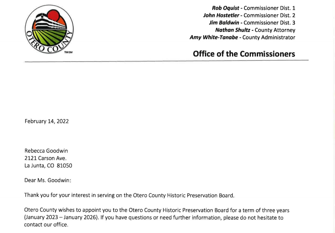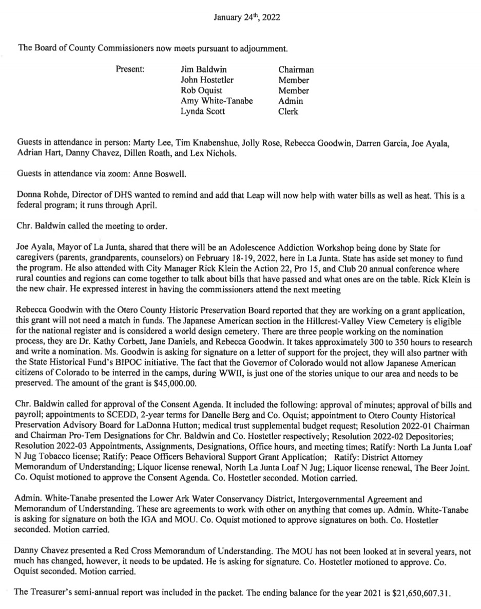 10) White-Tanabe reported that Otero County applied for a grant with Colorado Parks and Wildlife that would pay for a feasibility study to determine if it would be possible to add a hiking trail from the Oxbow Wildlife Area to Bent’s Old Fort National Historic Site. She said the grant total was $45,000, and one goal is to add a foot bridge to give people access from US Hwy 50. Learn more about the Oxbow Wildlife Area here: About The Valley: Colorado Parks and Wildlife Oxbow Wildlife Area