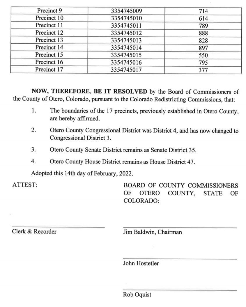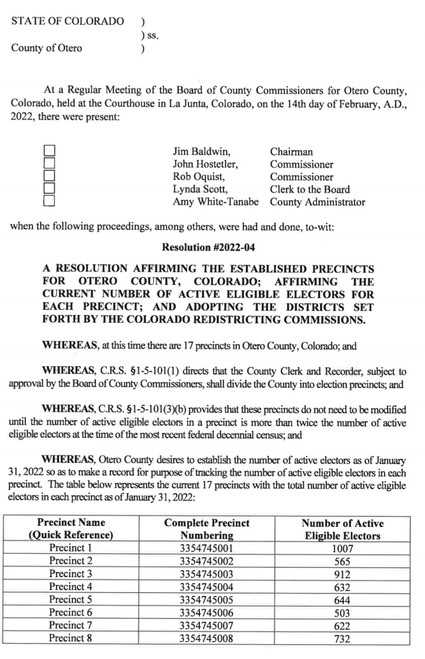2) After discussion with Otero County Clerk and Recorder Lynda Scott, the Commissioners unanimously voted to accept resolution 2022-04, establishing voting precincts. (attached in document gallery)