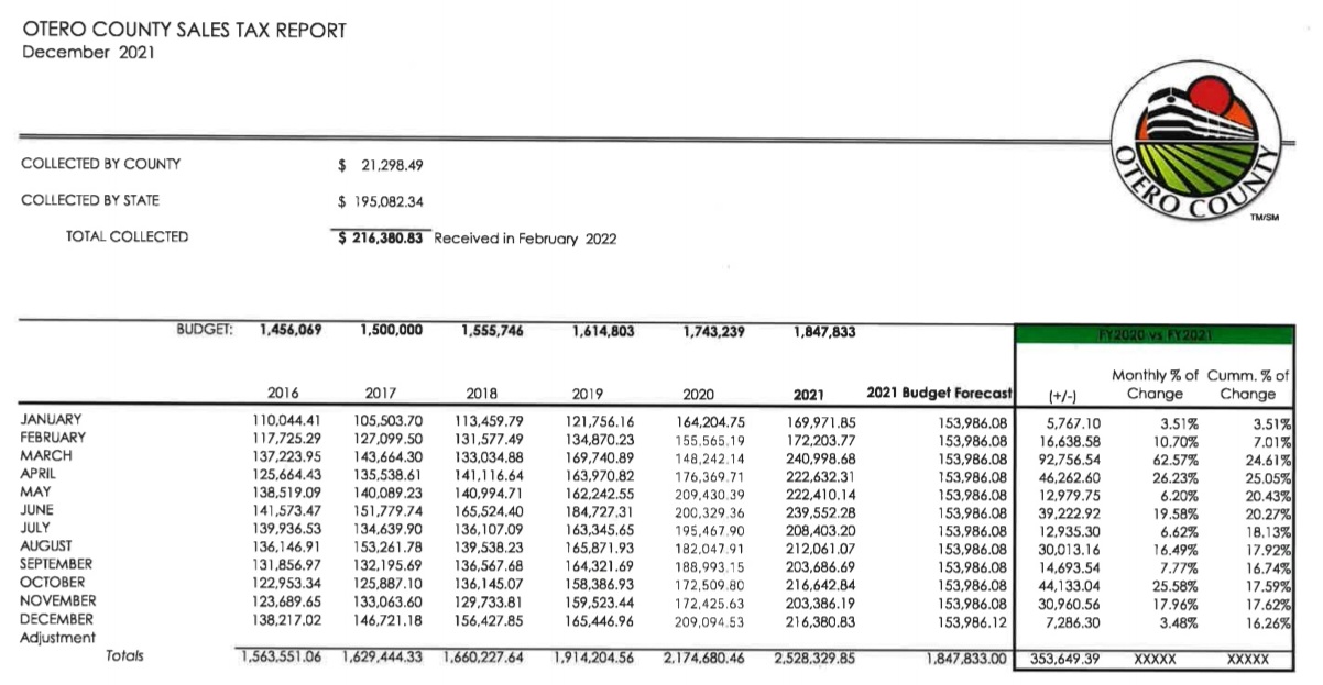 6) Otero County Administrator Amy White-Tanabe presented the county sales tax report. She said, the total sales tax for Otero County for 2021 was 2.5 million dollars and the projected revenue was only 1.5 million.
