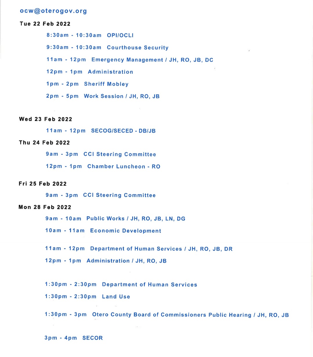 7) Otero County Clerk Lynda Scott reported that the Republican Caucus is scheduled for March 1st, and the Democratic Caucus is scheduled on March 5th, but will be held virtually.