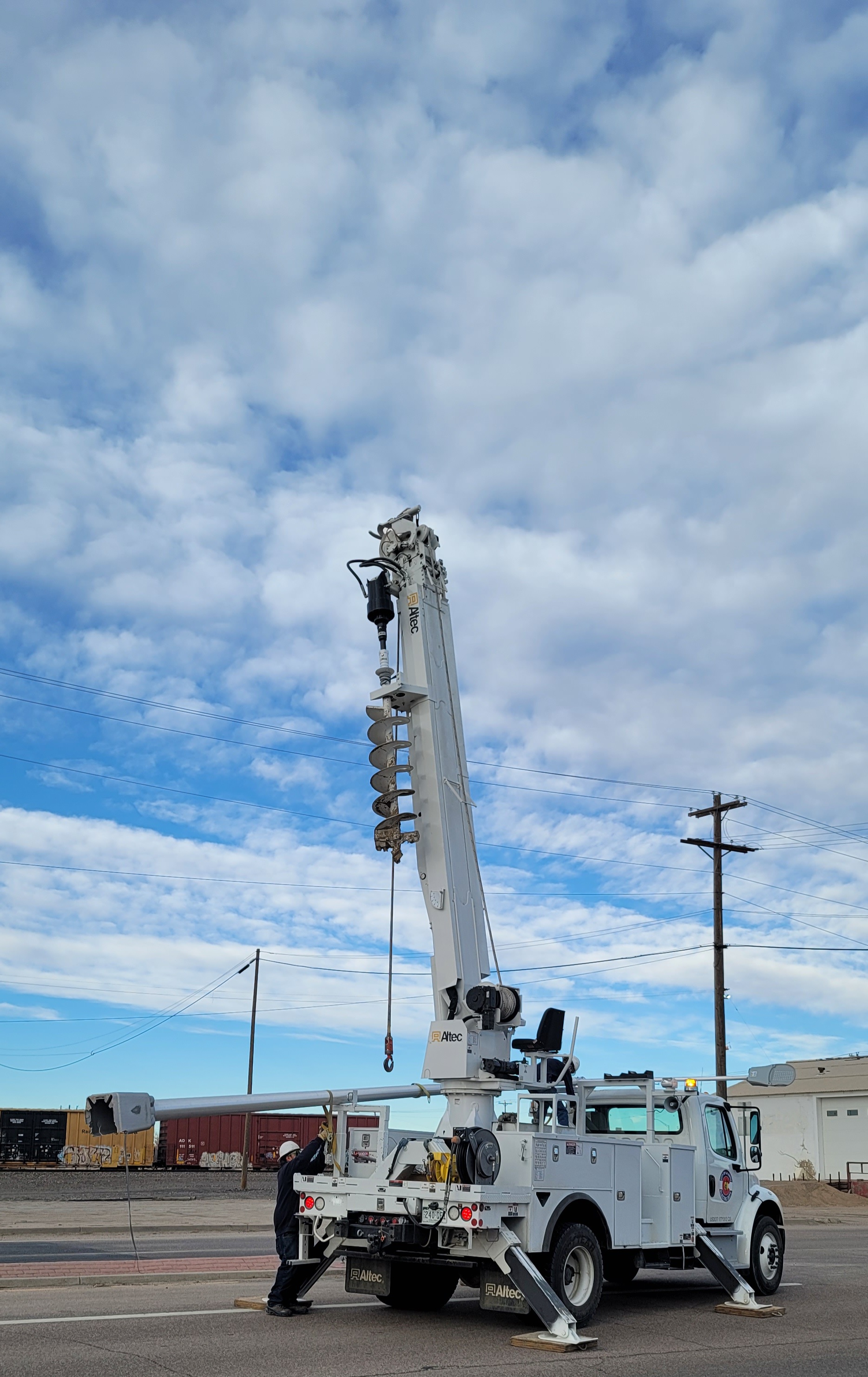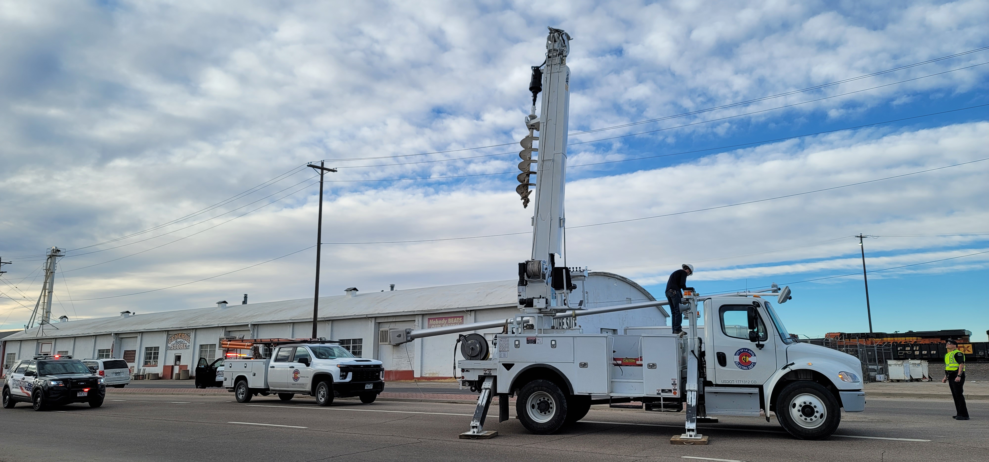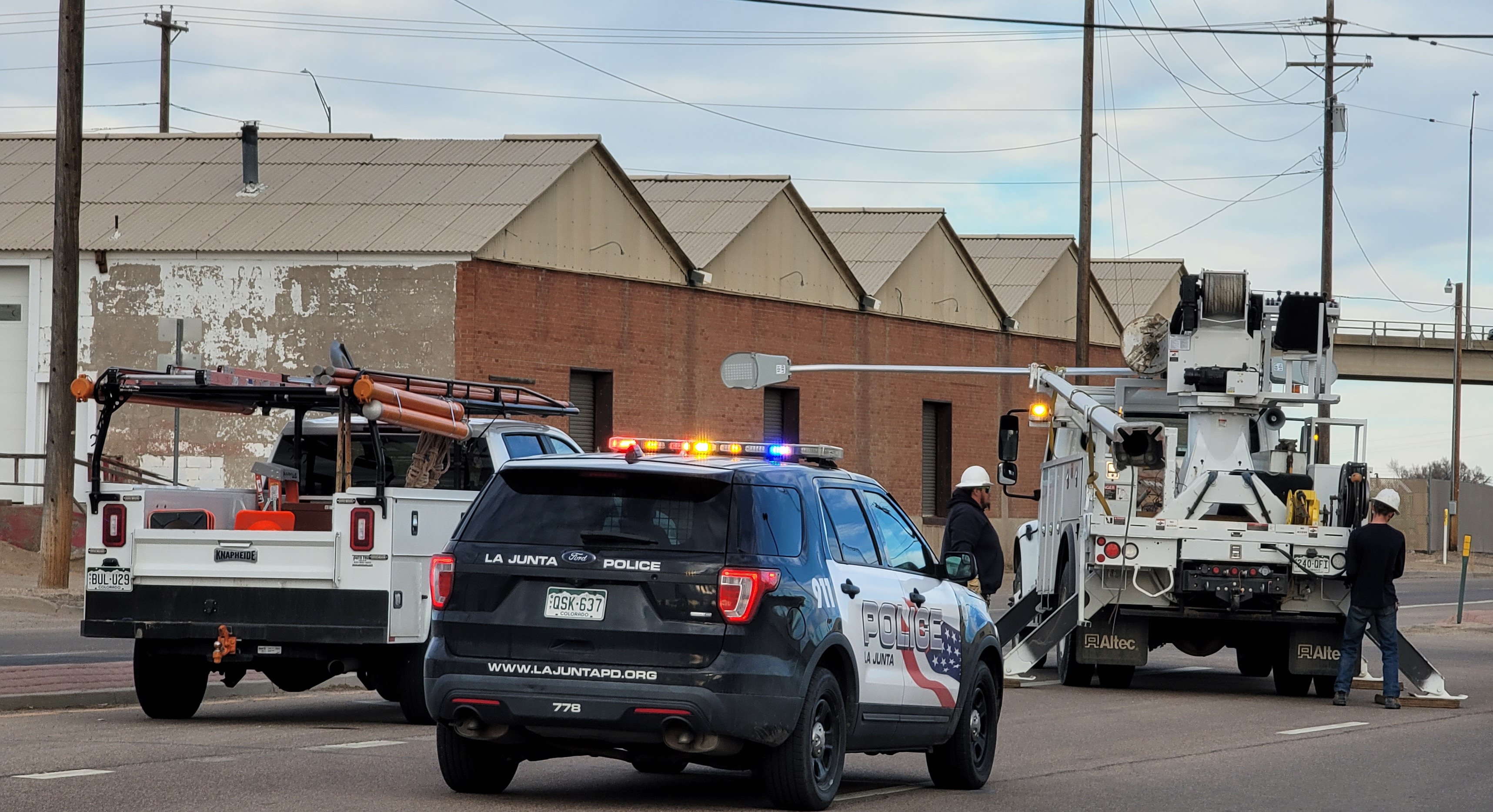 Description: The La Junta Police Department Responds to a single vehicle VS light pole accident on US Hwy 50 on Sunday, while the City Crew loads the light pole.