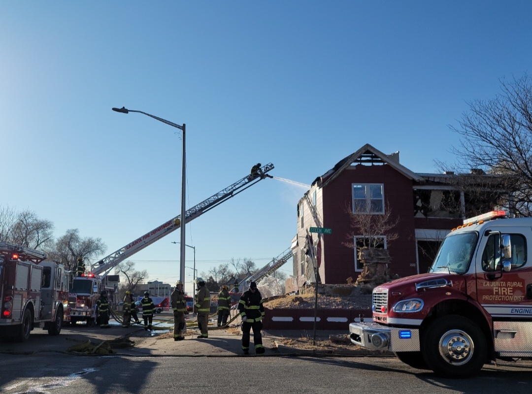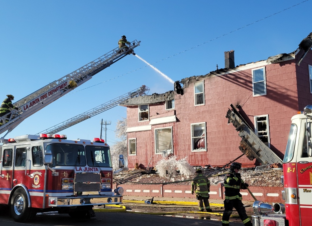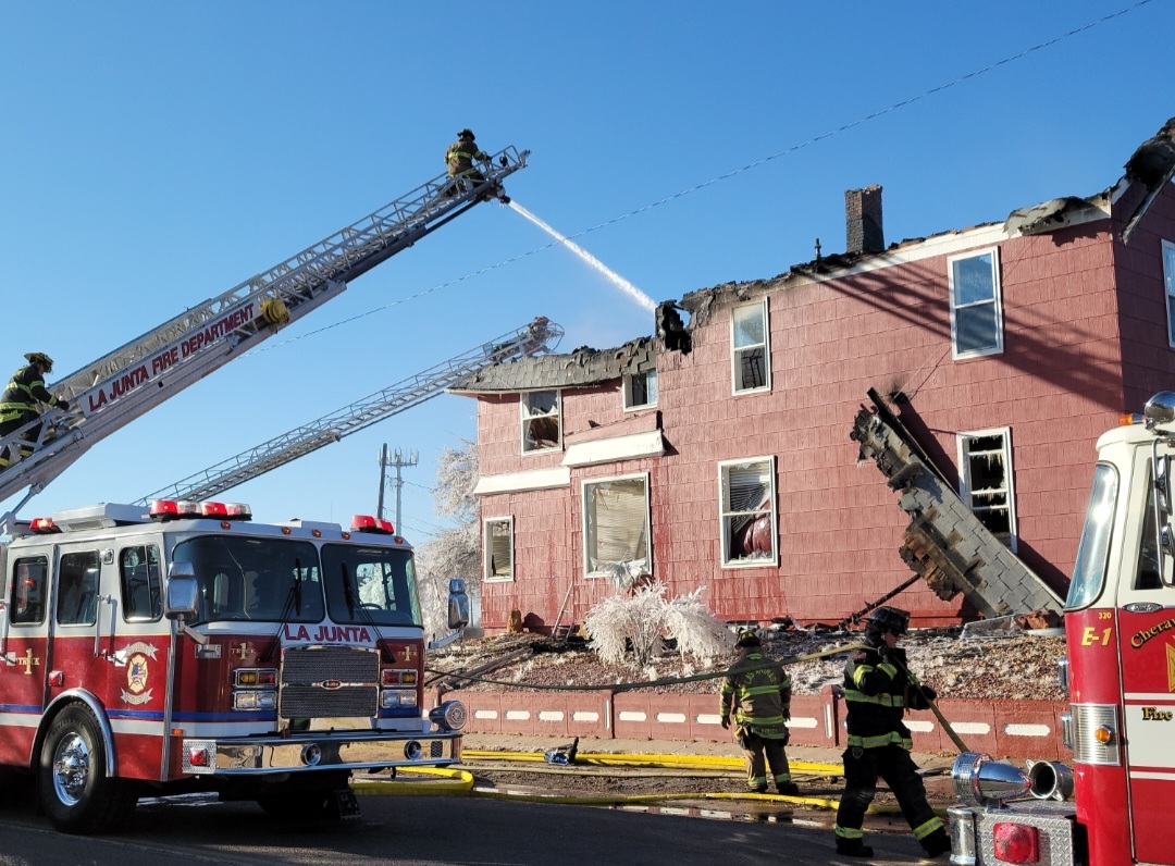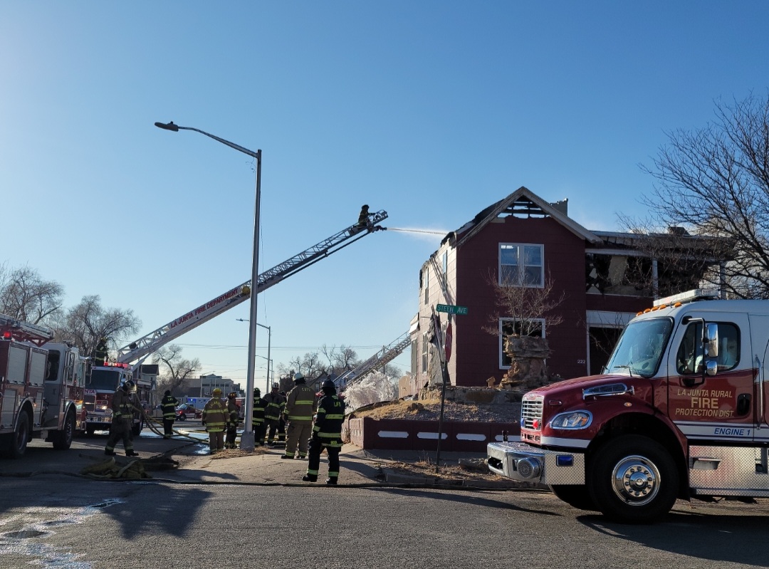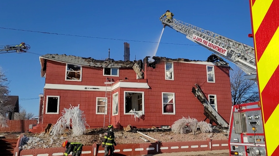 Description: The La Junta Fire Department spent much of the day fighting a two story structure fire on Wednesday. Press Play to watch interview with La Junta Fire Chief Brad Davidson. (Photos by: Adrian Hart)