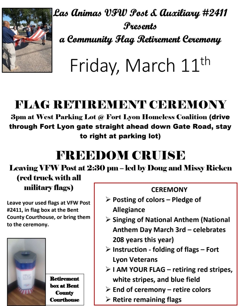 VFW Post & Auxiliary #2411 proudly invite the community to a “Flag Retirement Ceremony” at the Fort Lyon Homeless Coalition west side parking lot on Friday, March 18, 2022 at 3pm. The veterans at Fort Lyon have extended a special invitation to us for this event.