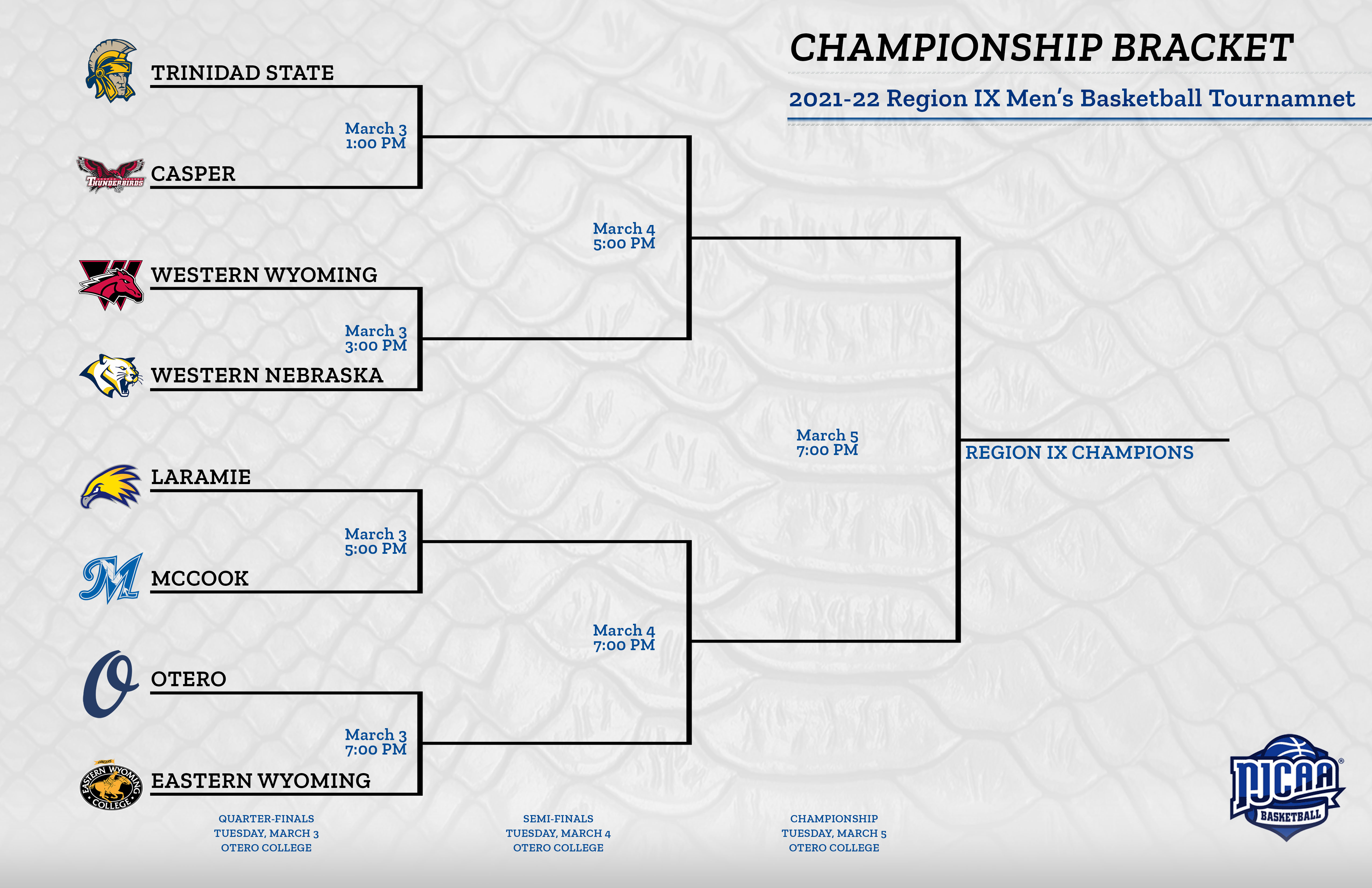 Eight teams will play at Otero in hopes of winning the Region IX Tournament to move on to the national tournament. Quarterfinal games will begin at 1 p.m. on Thursday in the McDivitt Center Gym, followed by games at 3 p.m., 5 p.m. and finally 7 p.m. when the Otero Rattlers will play against Eastern Wyoming College. Winners from Thursday’s games will play again on Friday at 5 and 7 p.m. and the championship will be held Saturday at 7 p.m. The bracket can also be found on the Otero College Men’s Basketball Facebook page.